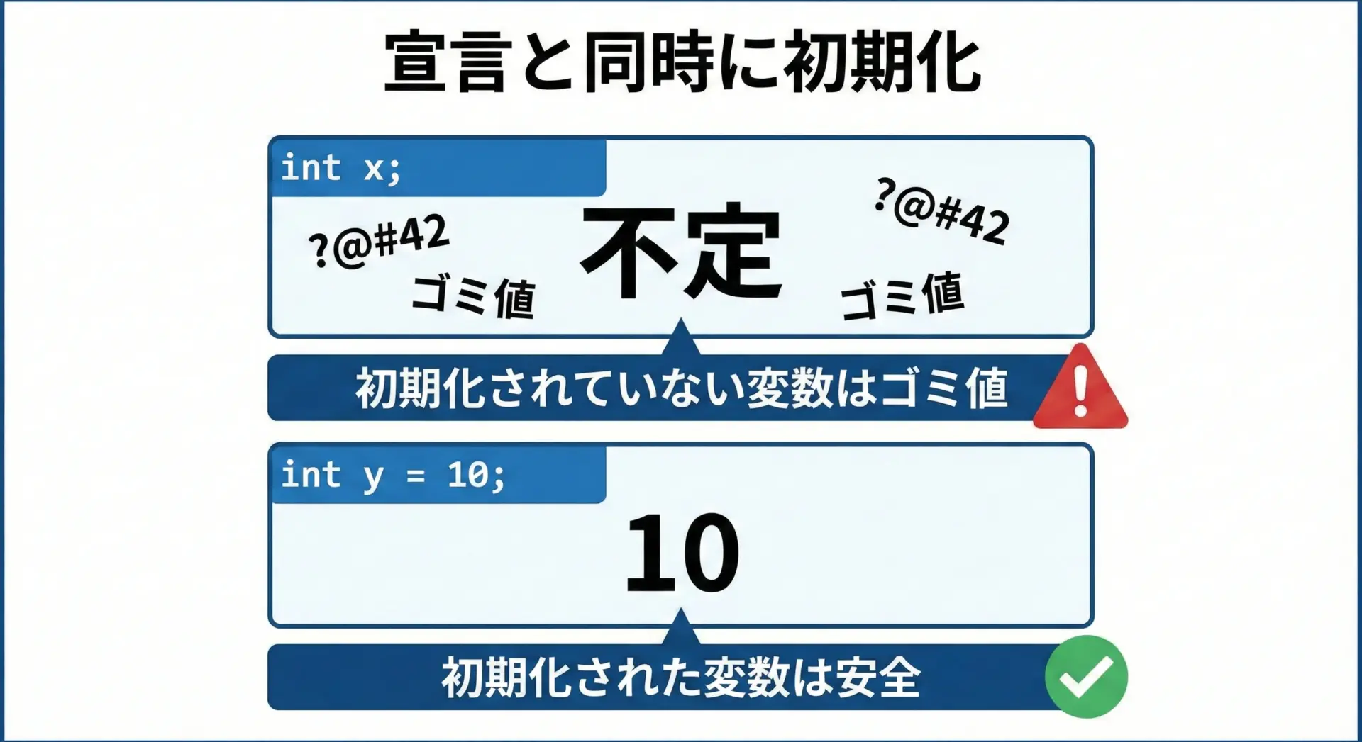 この点は後ほど詳しく扱いますが、可能な限り宣言と同時に初期化する習慣を付けることがとても重要です。