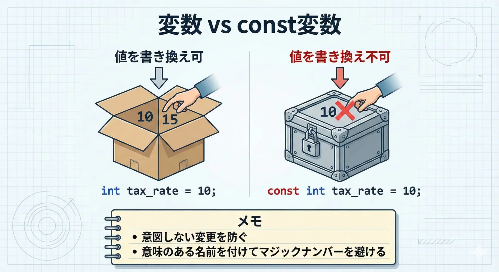 例えば3.1415910といった数字を直接コードに書くのではなく、PITAX_RATEのような名前を付けたconst変数を使うことで、「マジックナンバー」を避けることができます。