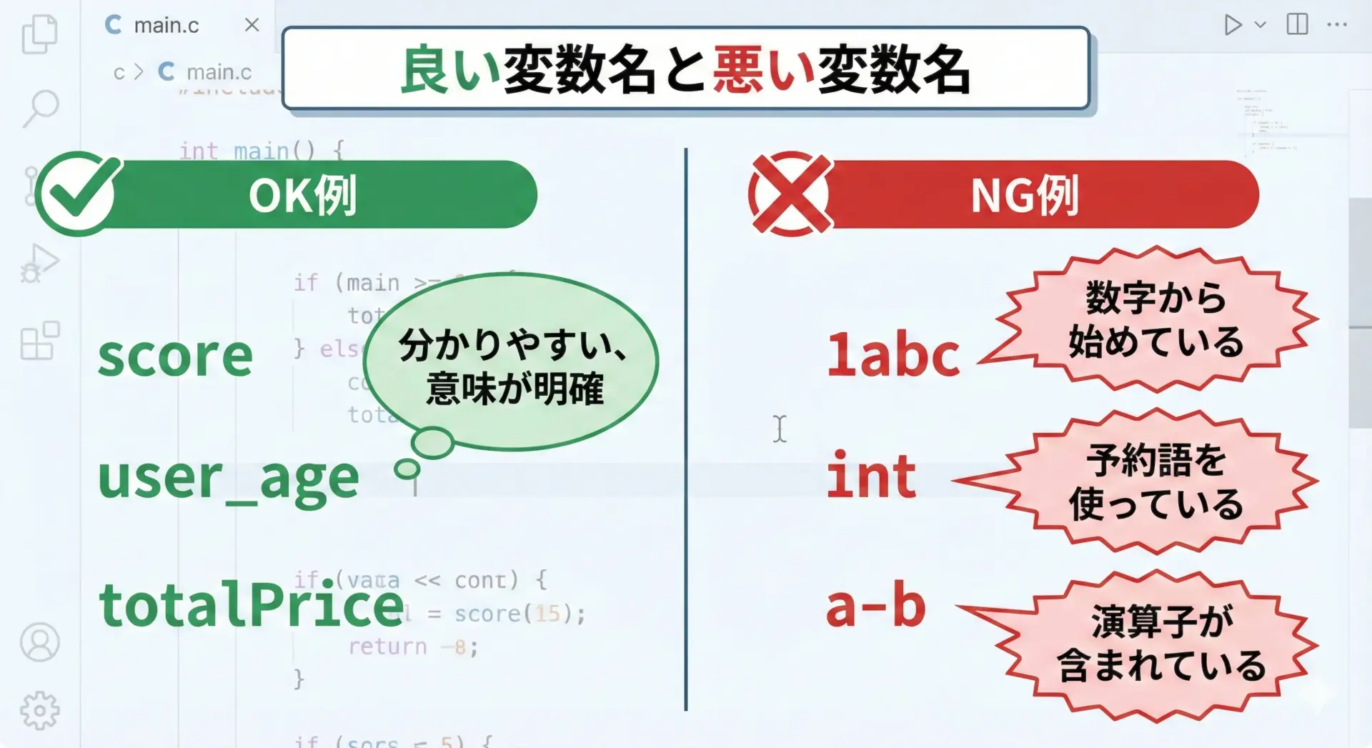 また、C言語ではuserAgeのように途中を大文字で区切る(camelCase)か、user_ageのようにアンダースコアで区切る(snake_case)ことがよくあります。
