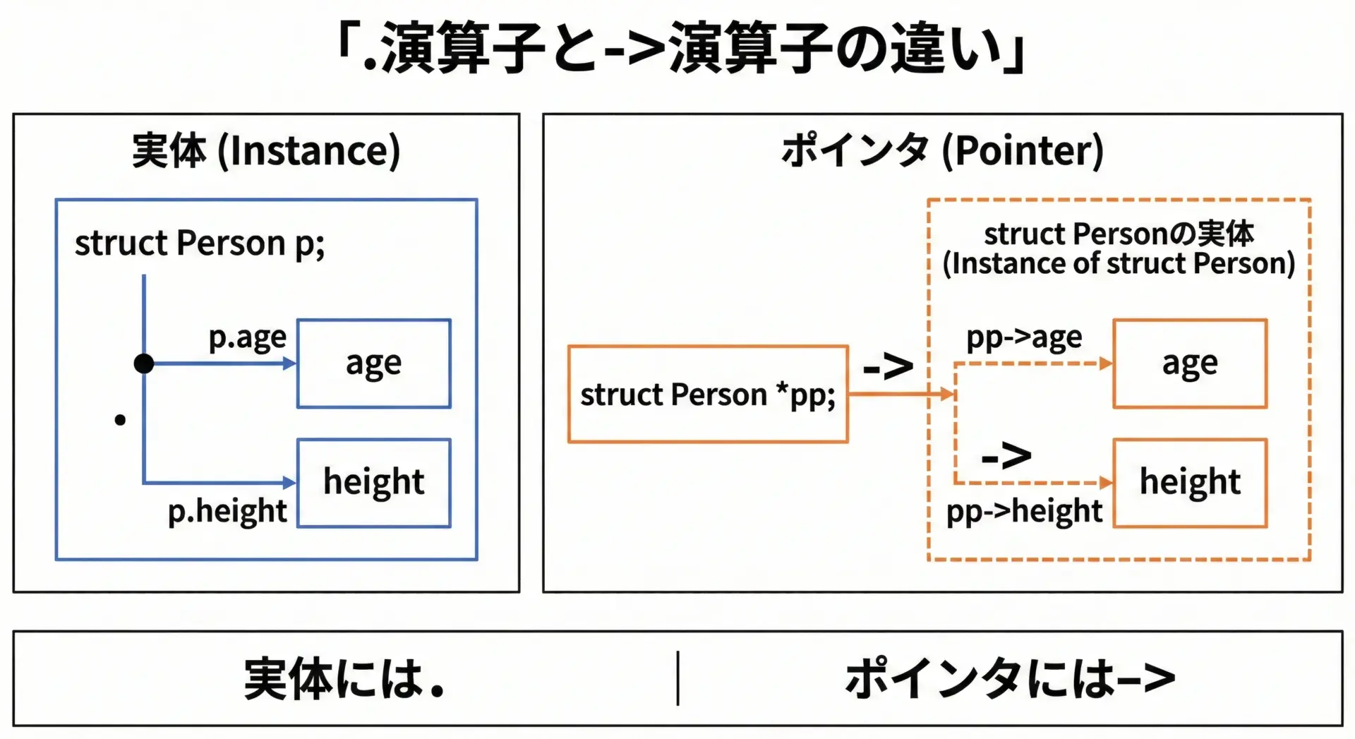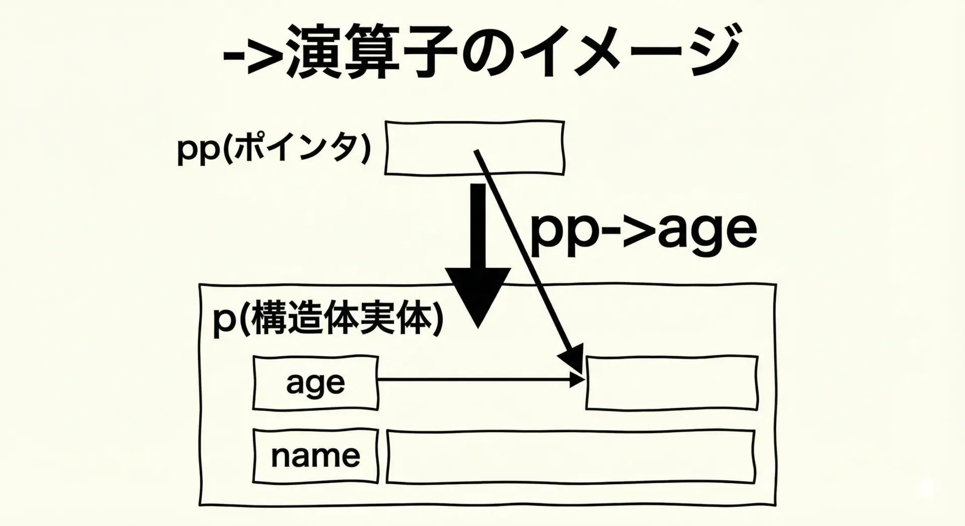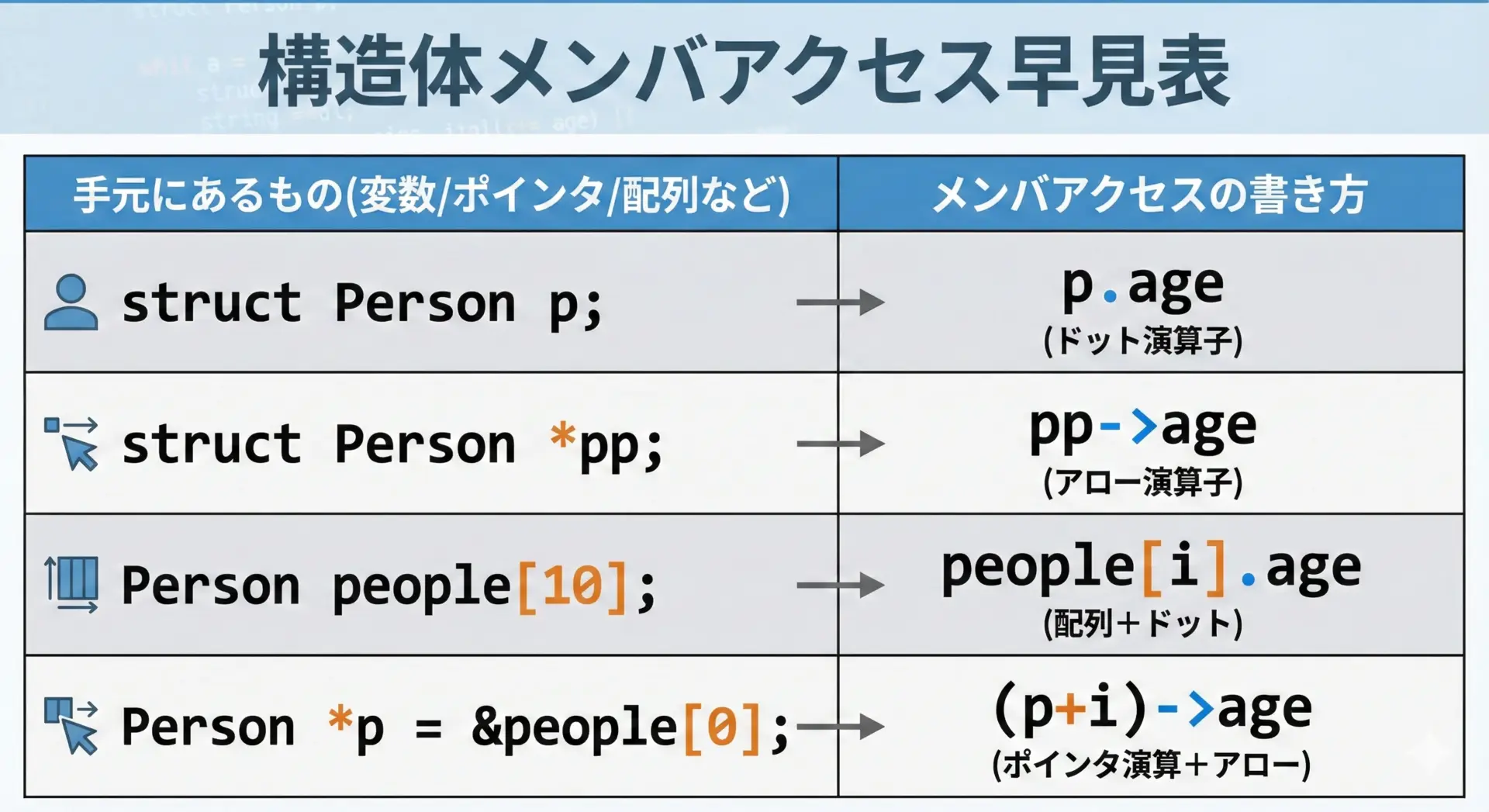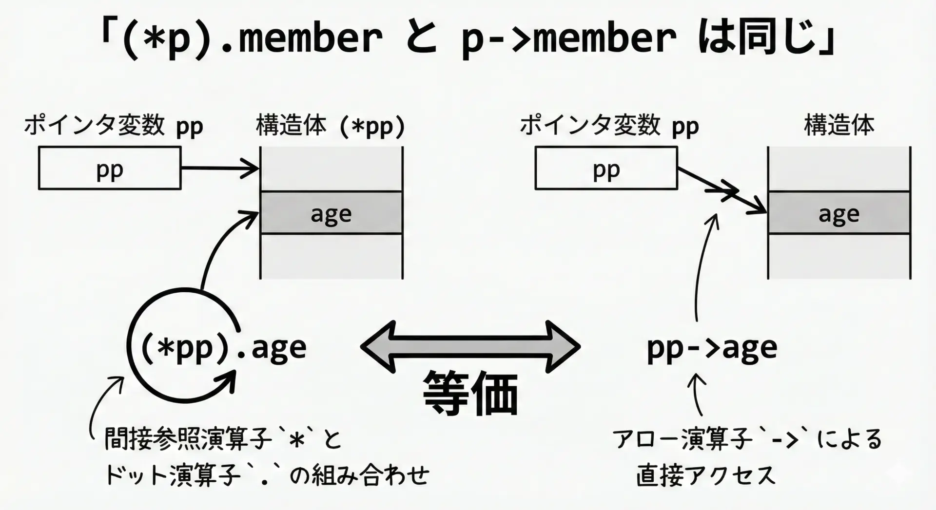 | 参考: 構造体ポインタ(詳細は別記事) | (*ptr).メンバー または ptr->メンバー | (*pp).x |