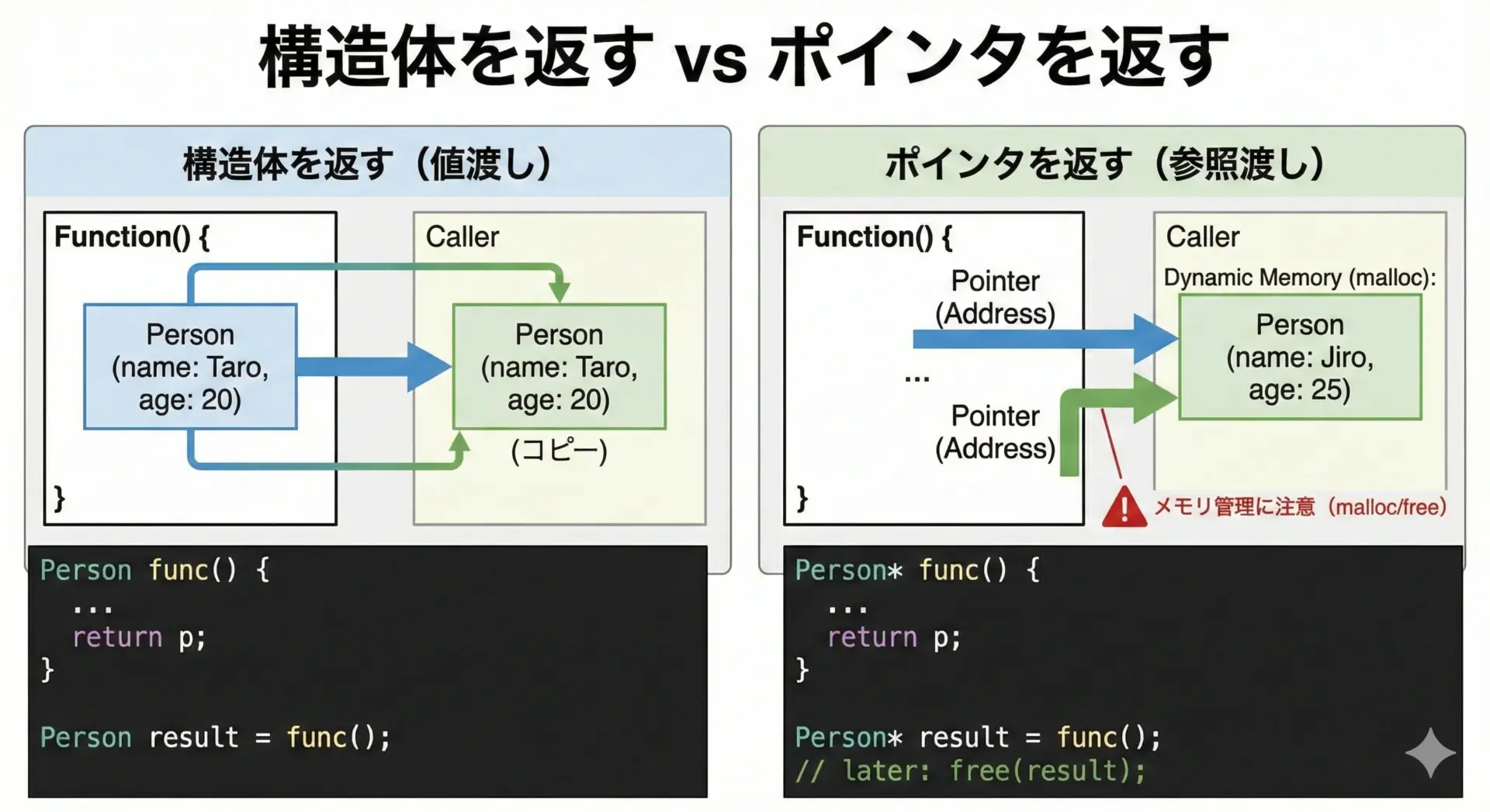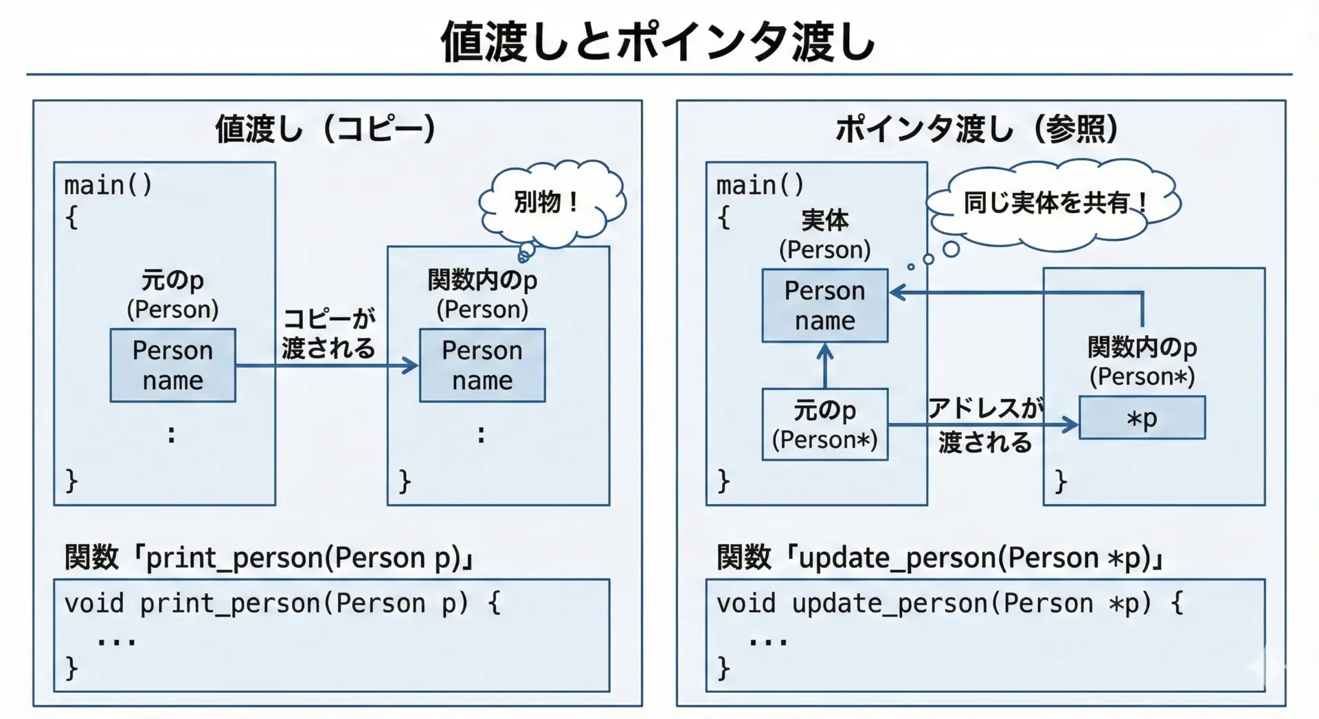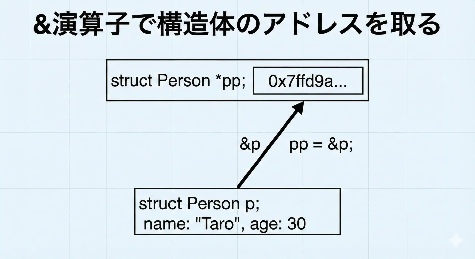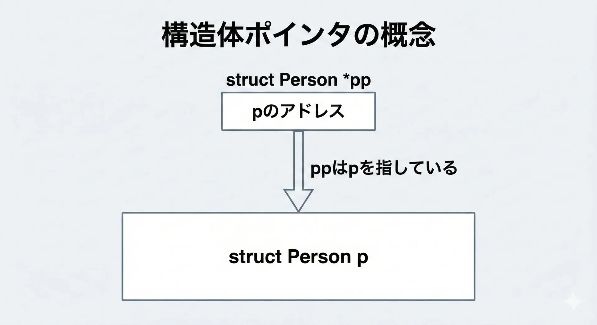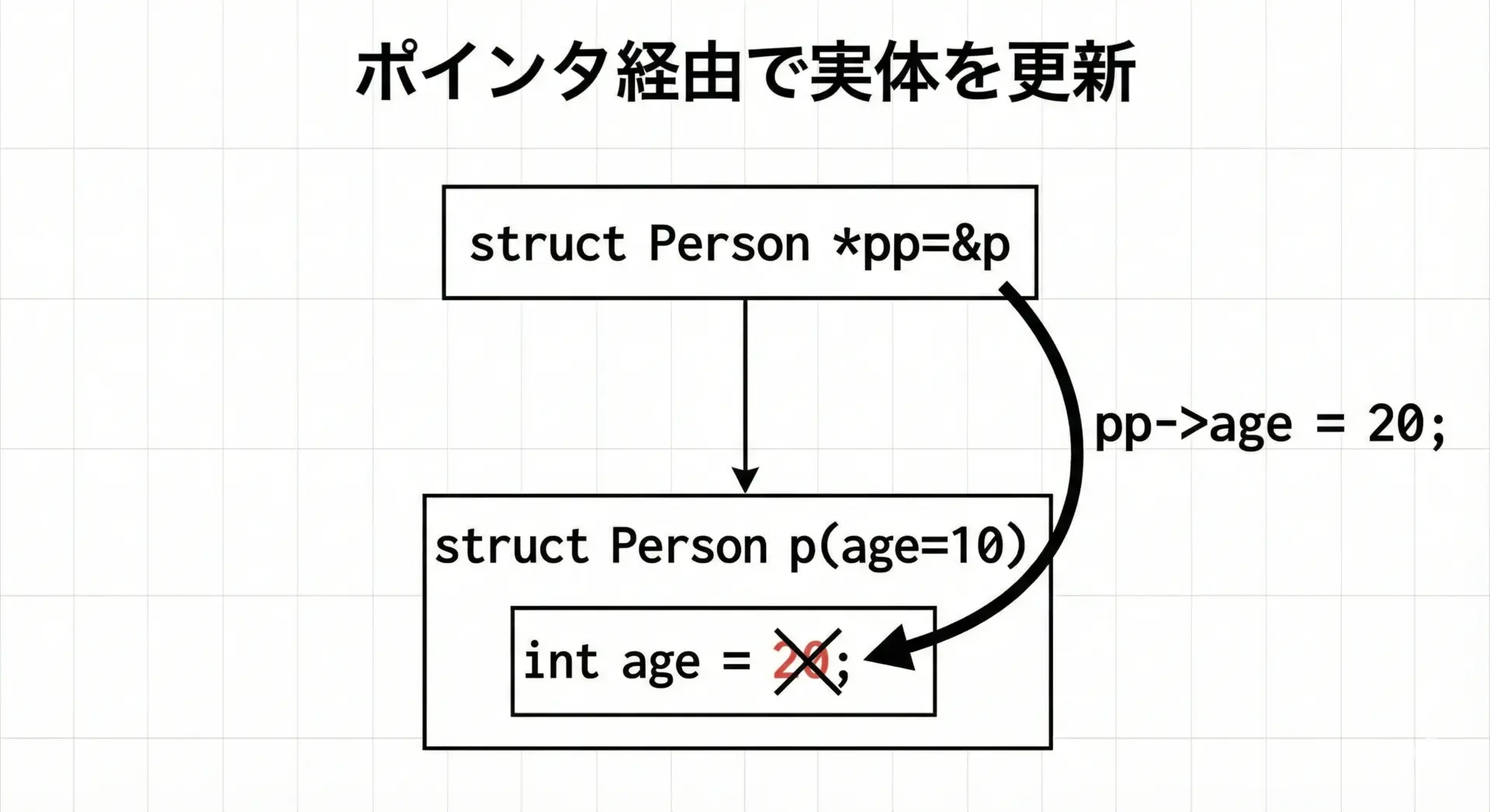 | 参考: 構造体ポインタ(詳細は別記事) | (*ptr).メンバー または ptr->メンバー | (*pp).x |