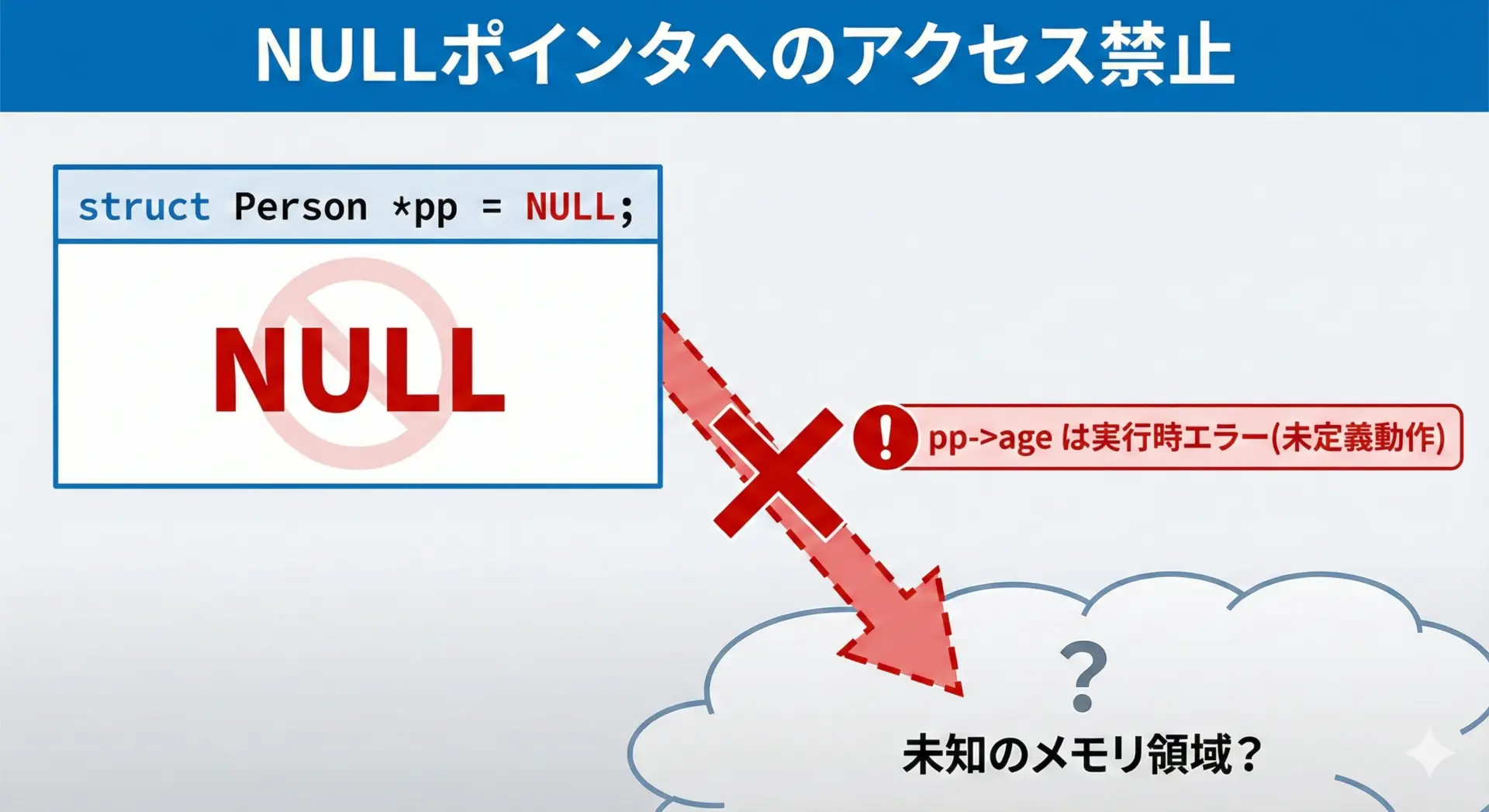ポインタにドットは使えない点と、未初期化の読み取りは未定義動作である点は必ず押さえましょう。