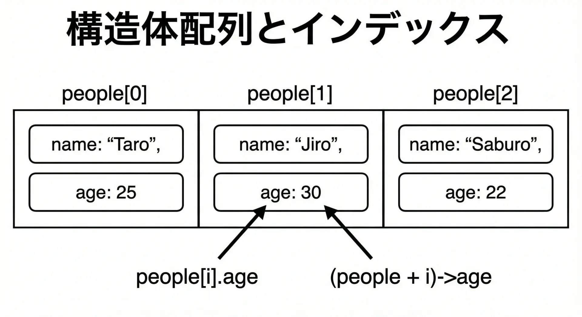 | 配列要素のメンバー | 配列[i].メンバー | people[0].height |