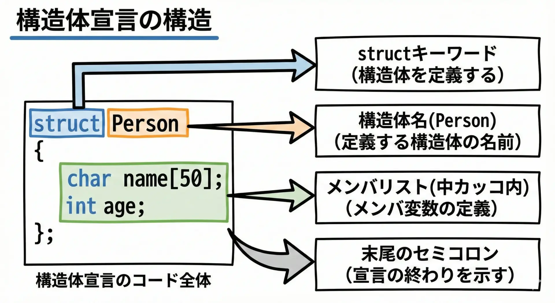 構造体(struct)は、異なる型の値をひとまとまりにしたユーザー定義の型です。