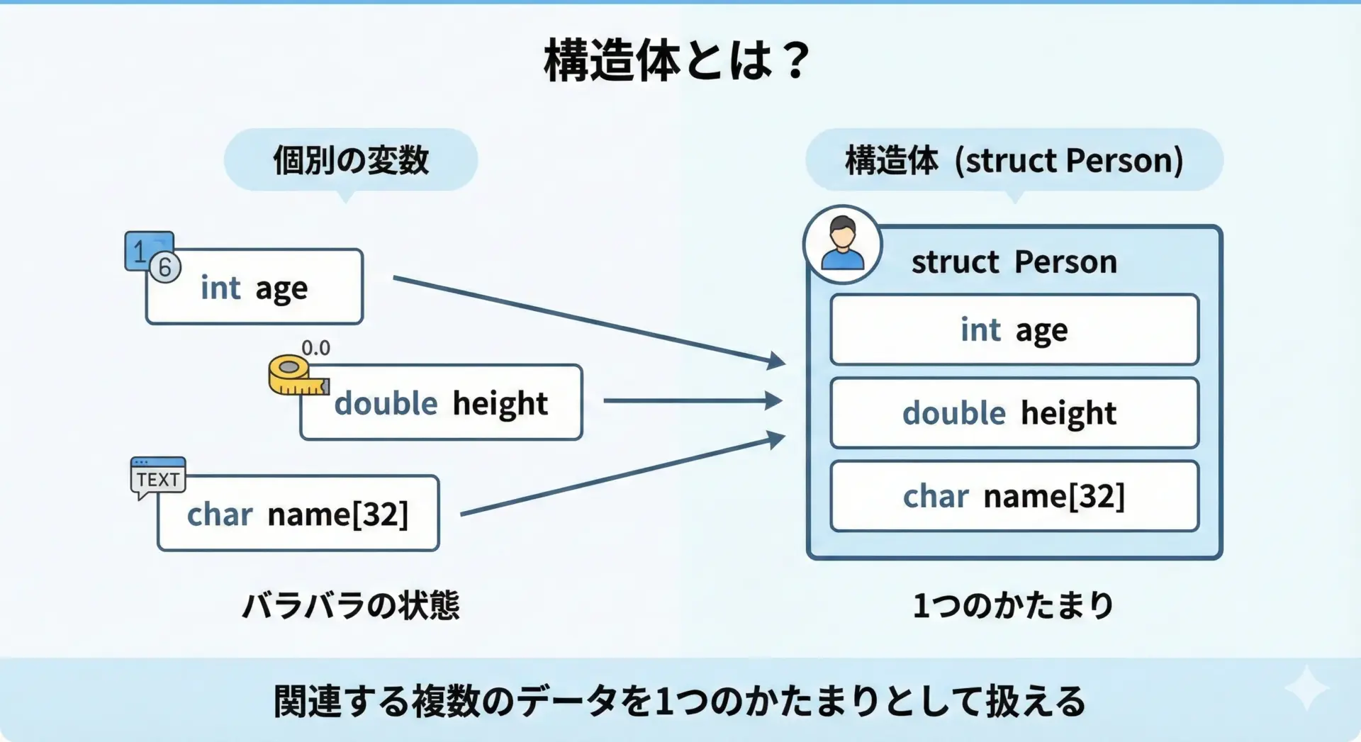 C言語の構造体は、複数の関連する値を1つにまとめて扱える便利な仕組みです。