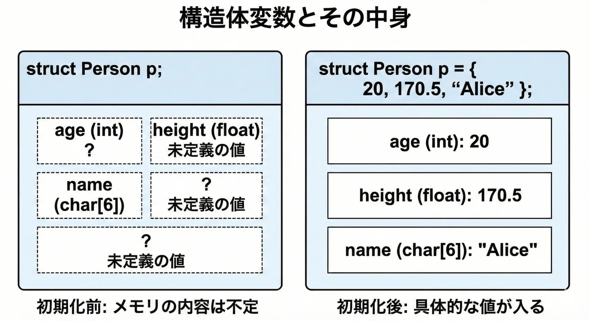 構造体変数を使う前に、必ず初期化または必要なメンバーへ代入してから読むようにしましょう。