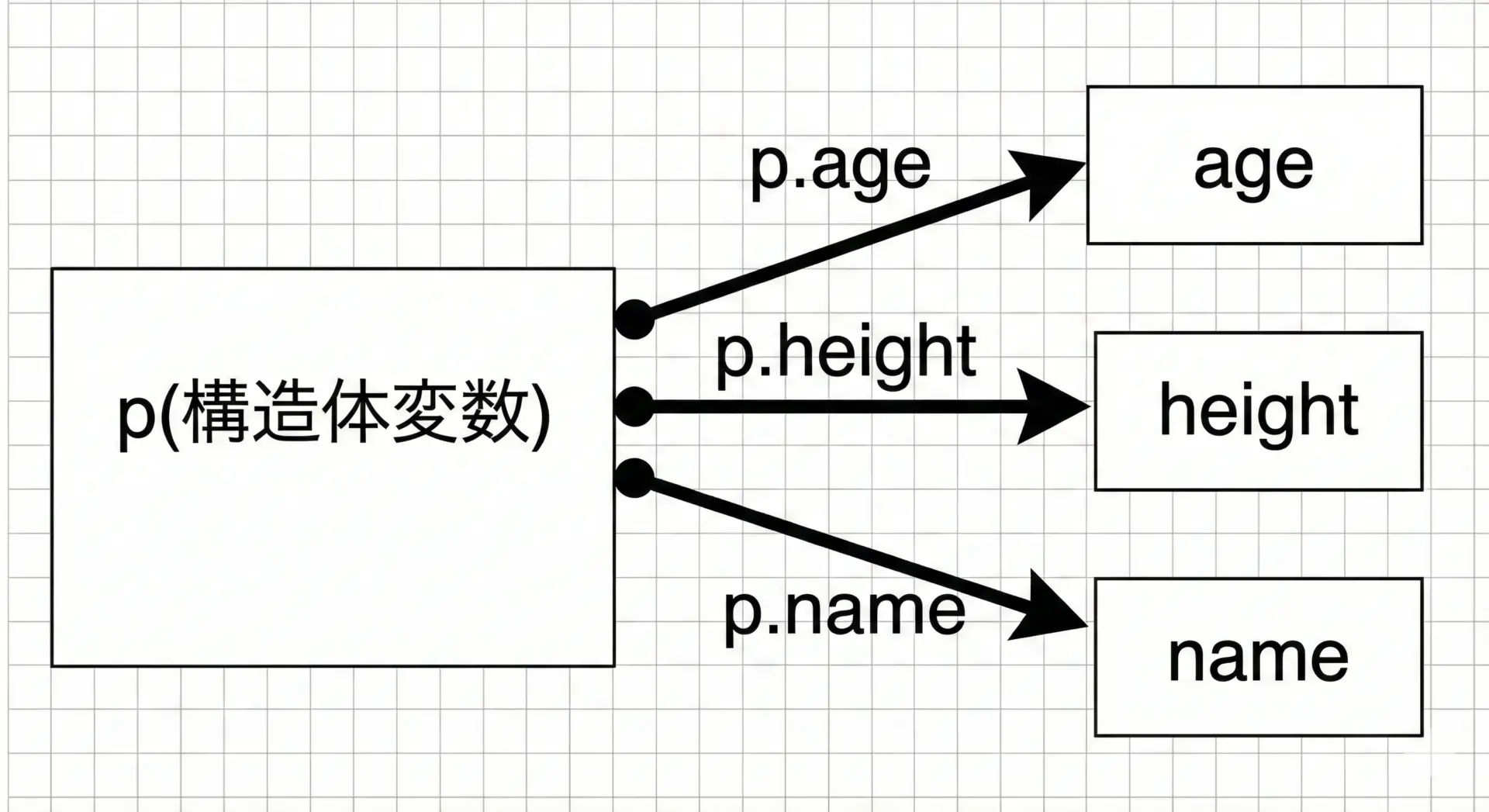 | 構造体変数のメンバー | 変数.メンバー | p.age |
