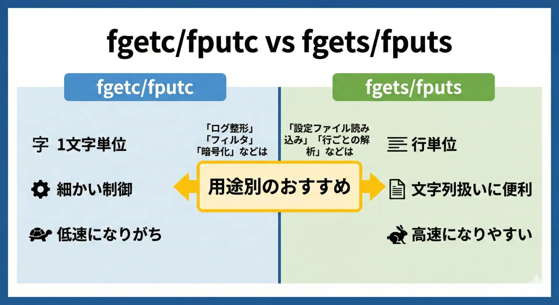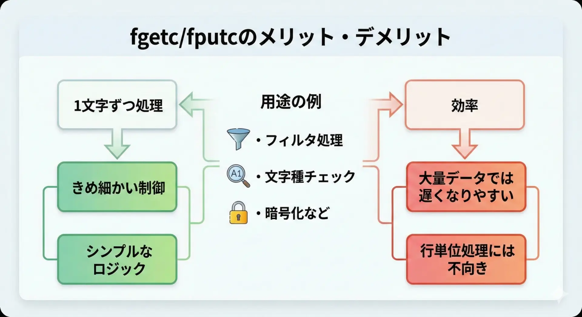 fgetc / fputc | 文字 | 細かい制御・実装が直感的 | 大量データでは遅くなりやすい |