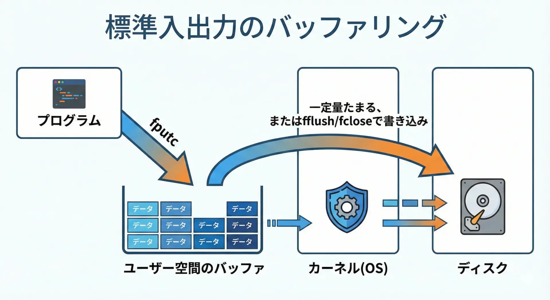 これはfputcが呼ばれた瞬間に必ずしもディスクに書き込まれるわけではないということを意味します。