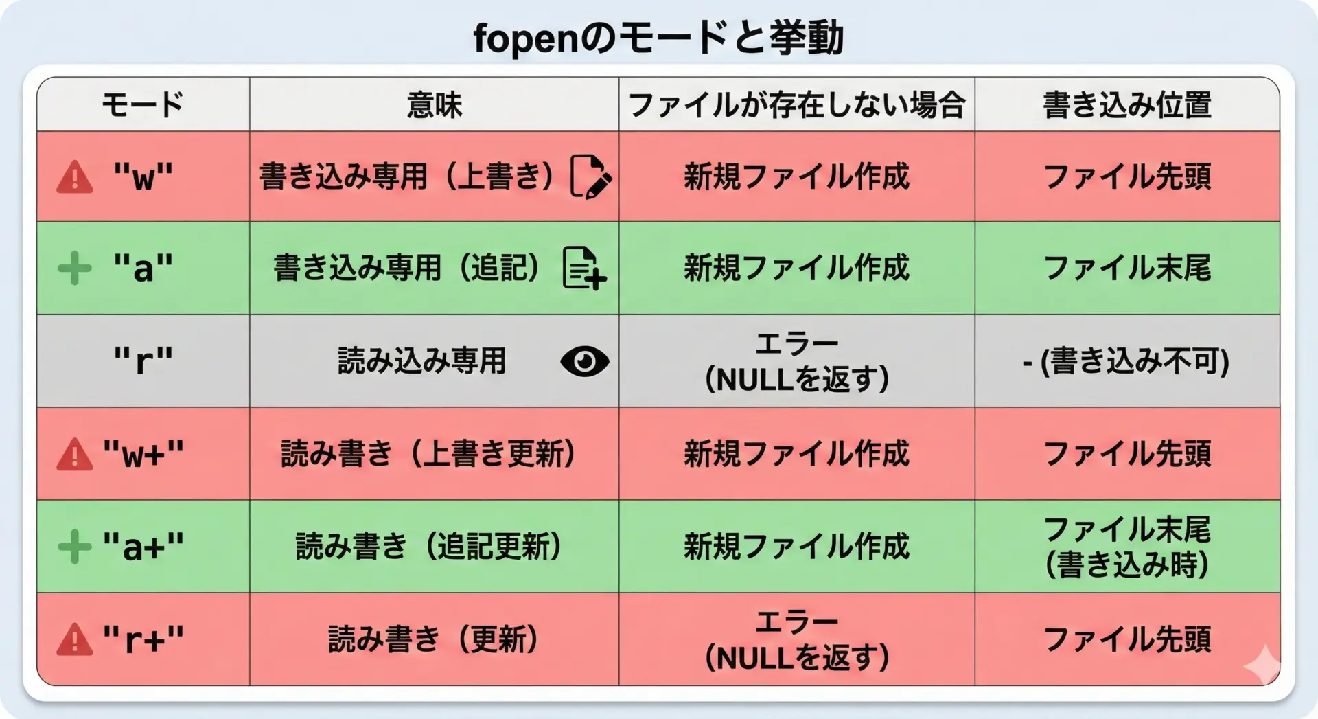 fputcを利用する際には、fopenで指定するモードがとても重要です。