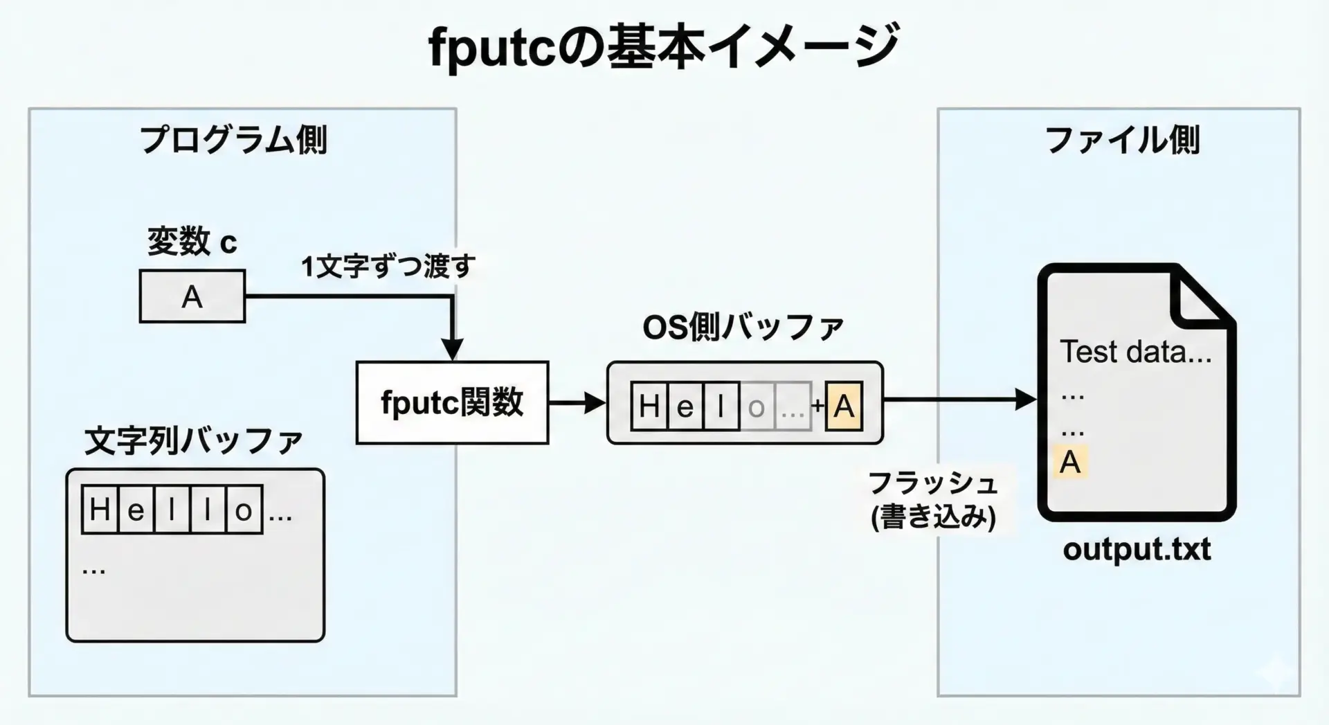 - fputcは、まずメモリ上のバッファに1文字書き込みます。