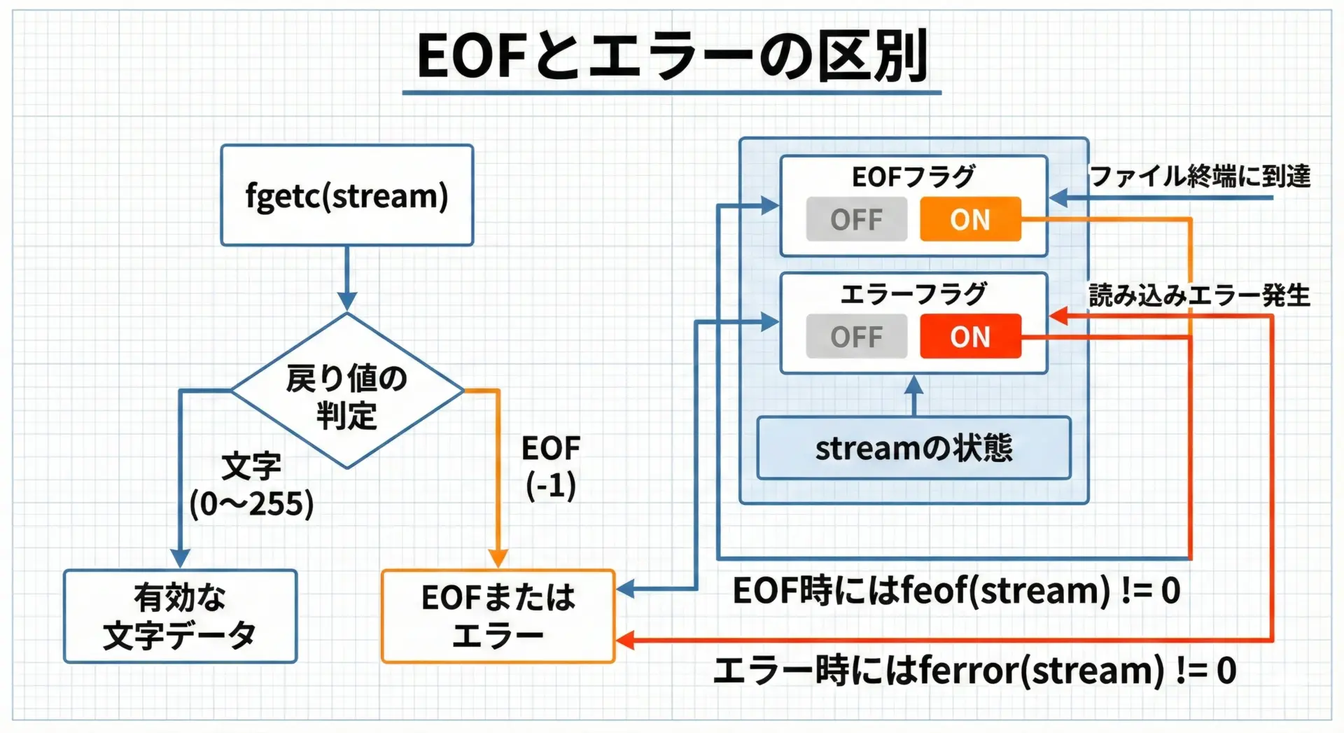 このように、ループを抜けた後でfeofとferrorの両方をチェックすることで、EOFなのかエラーなのかを確実に判定できます。