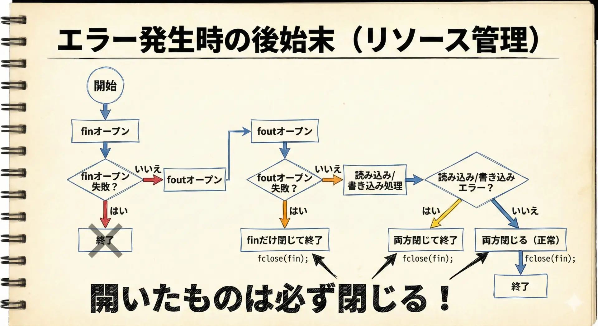 foutを開くのに失敗したら、その時点でfinだけは開かれているので、必ずfclose(fin)を呼んでから終了します。 - 読み込みや書き込みの途中でエラーが起きた場合には、両方のファイルを可能な限り