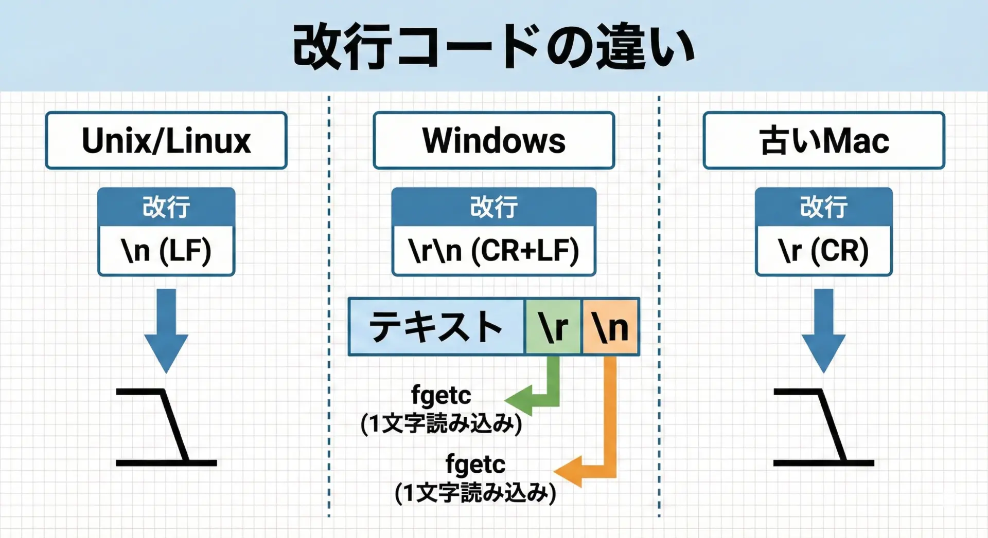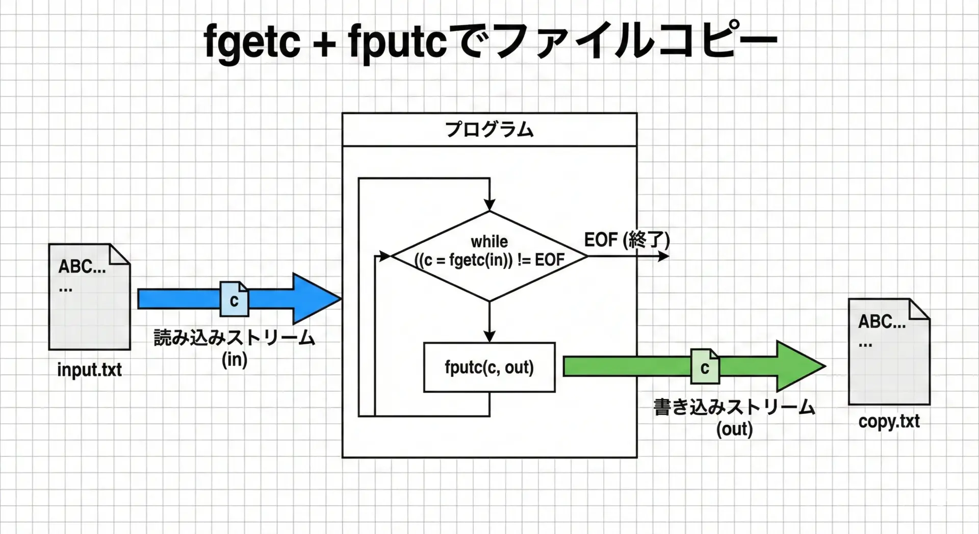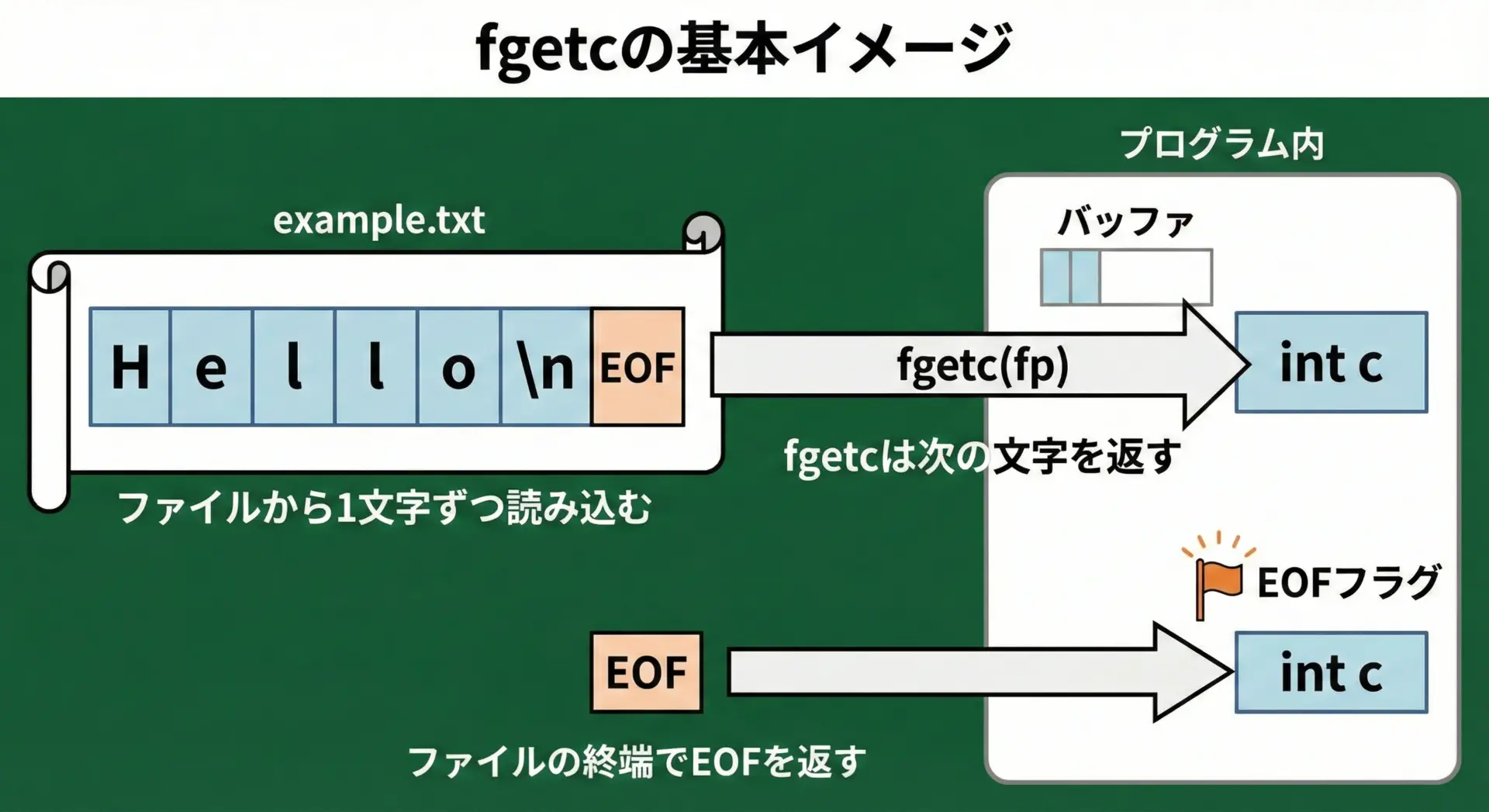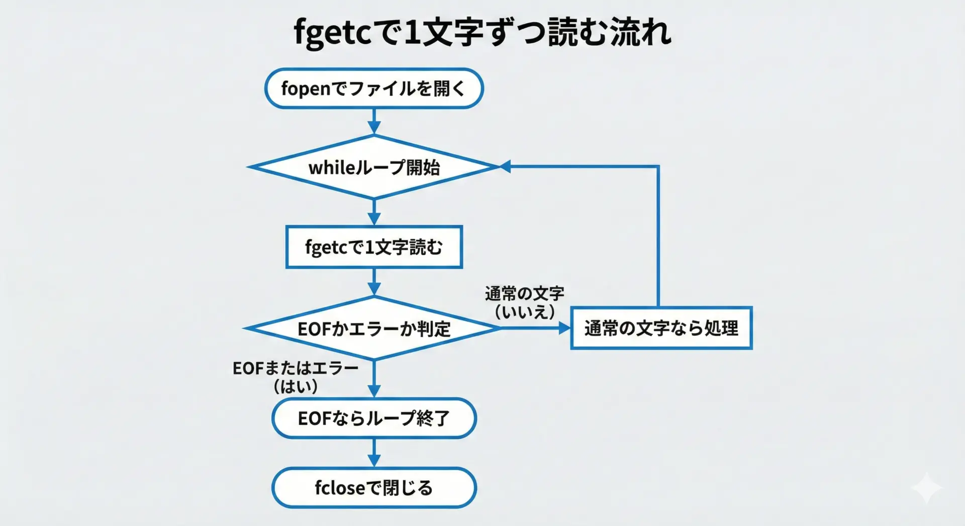 while ((c = fgetc(fp)) != EOF)のような定型的な書き方で読み取りループが組めます。 - バイナリファイルでも使用できますが、今回のテーマではテキストファイル前提で説明します。