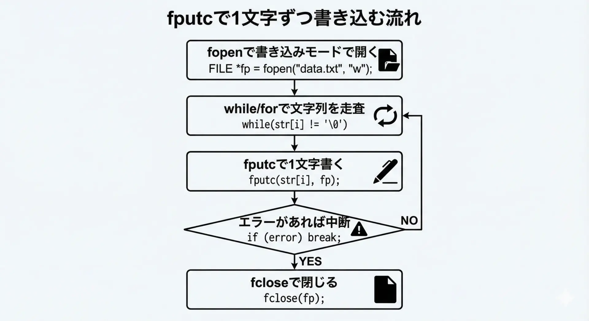 テキスト全体を一気に出力するfputsと比べて、この方法は文字ごとに判定や変換処理を挟める点が利点です。