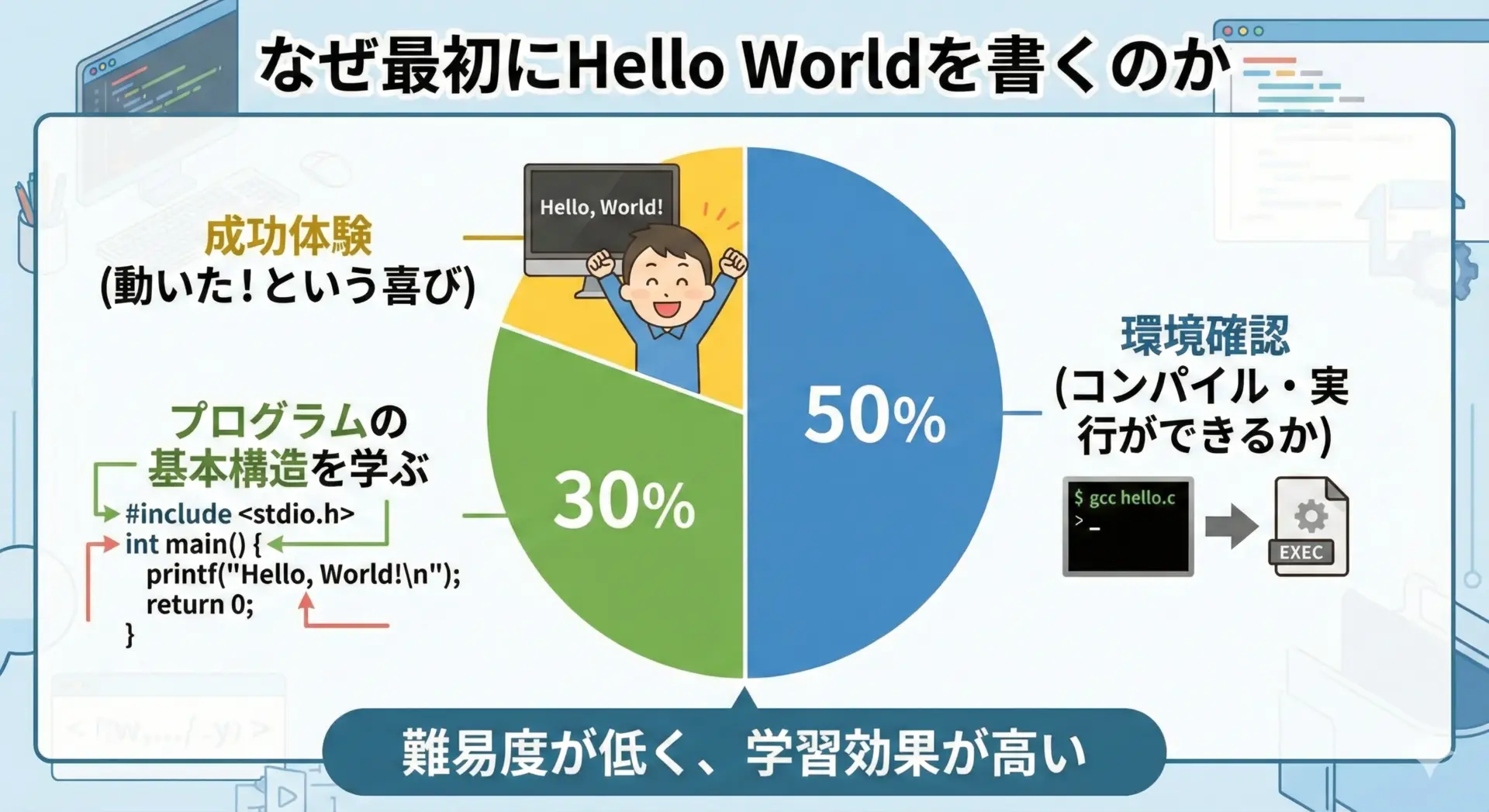 C言語入門で、ほぼ必ず最初にHello Worldを書くのには、いくつかの理由があります。