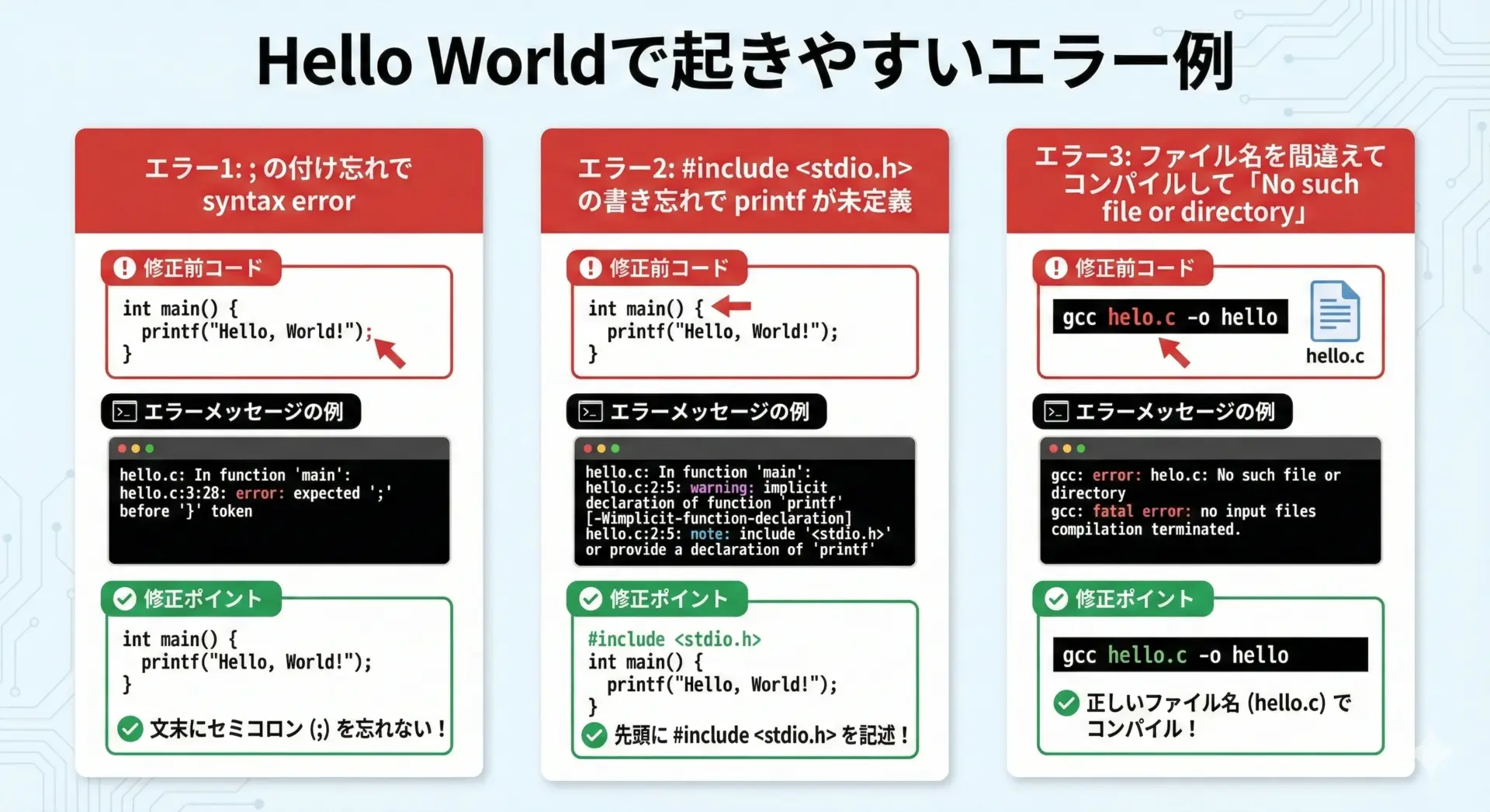 Hello Worldプログラムはシンプルですが、それでも初心者がつまずきやすい典型的なコンパイルエラーがいくつかあります。
