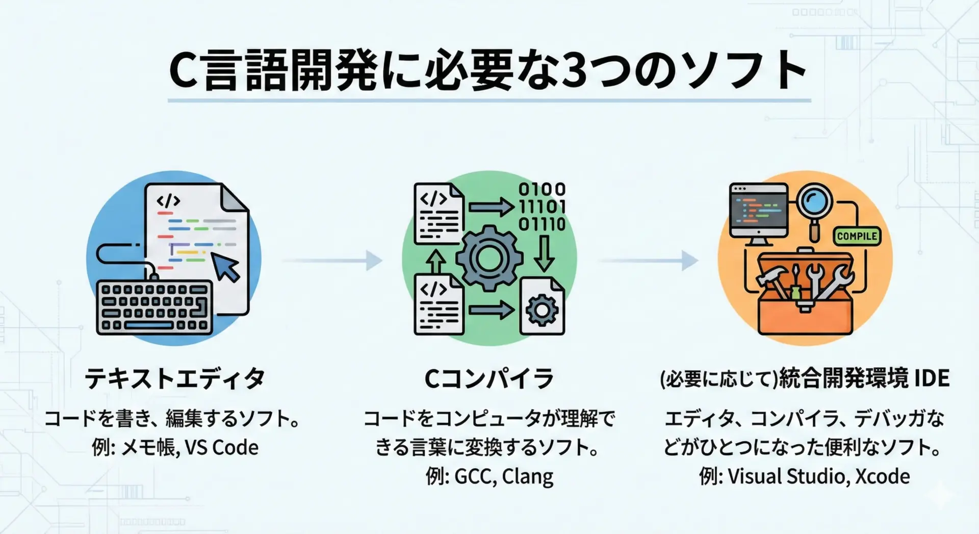 C言語でHello Worldを書くためには、次のようなソフトウェアが必要です。