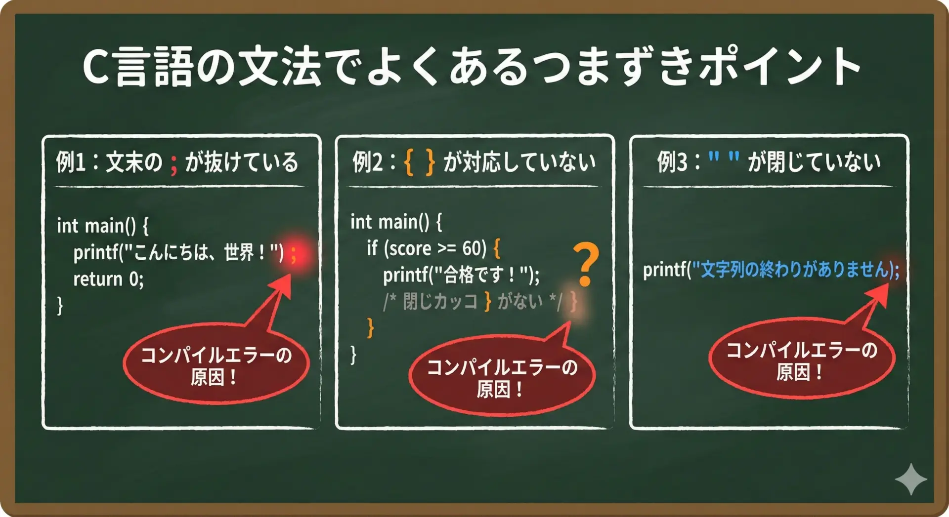 C言語では、文法上のルールを少しでも破ると、コンパイルエラーになってしまいます。