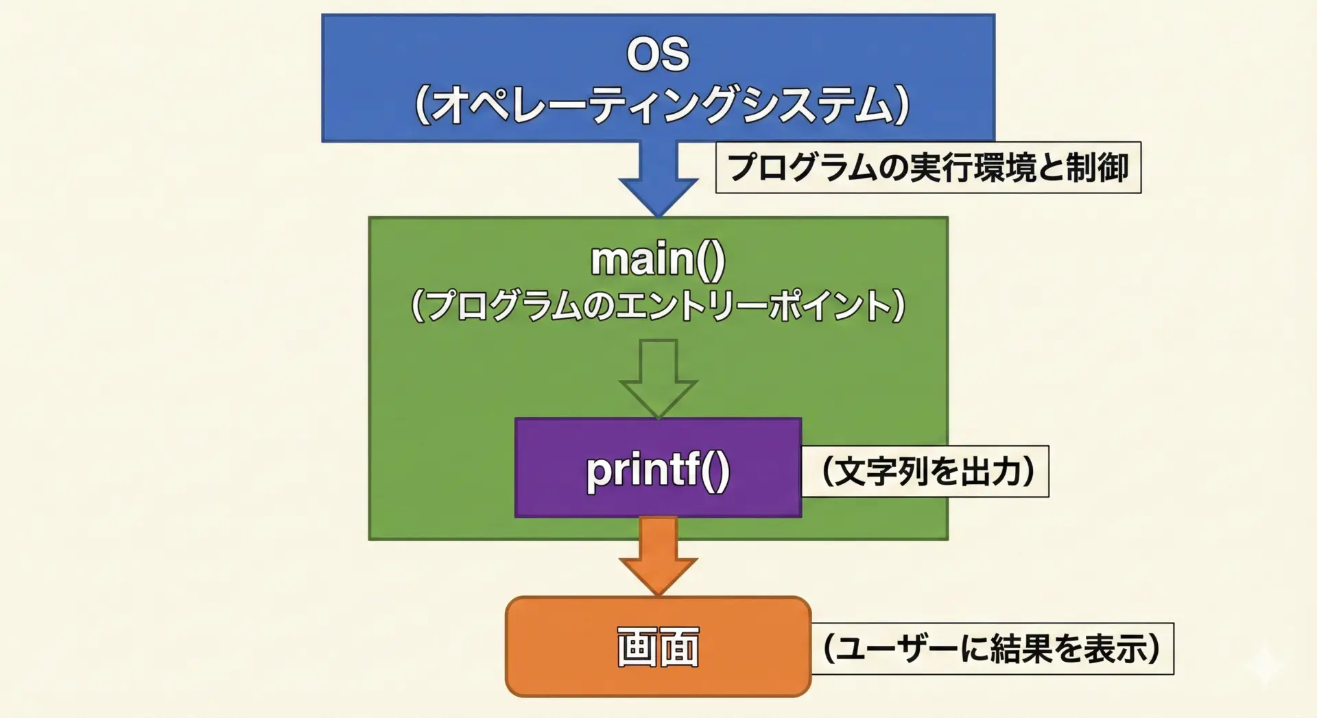 main関数内でprintfが呼び出されると、OSの提供する仕組みを通じて画面に文字が表示される、という流れになっています。