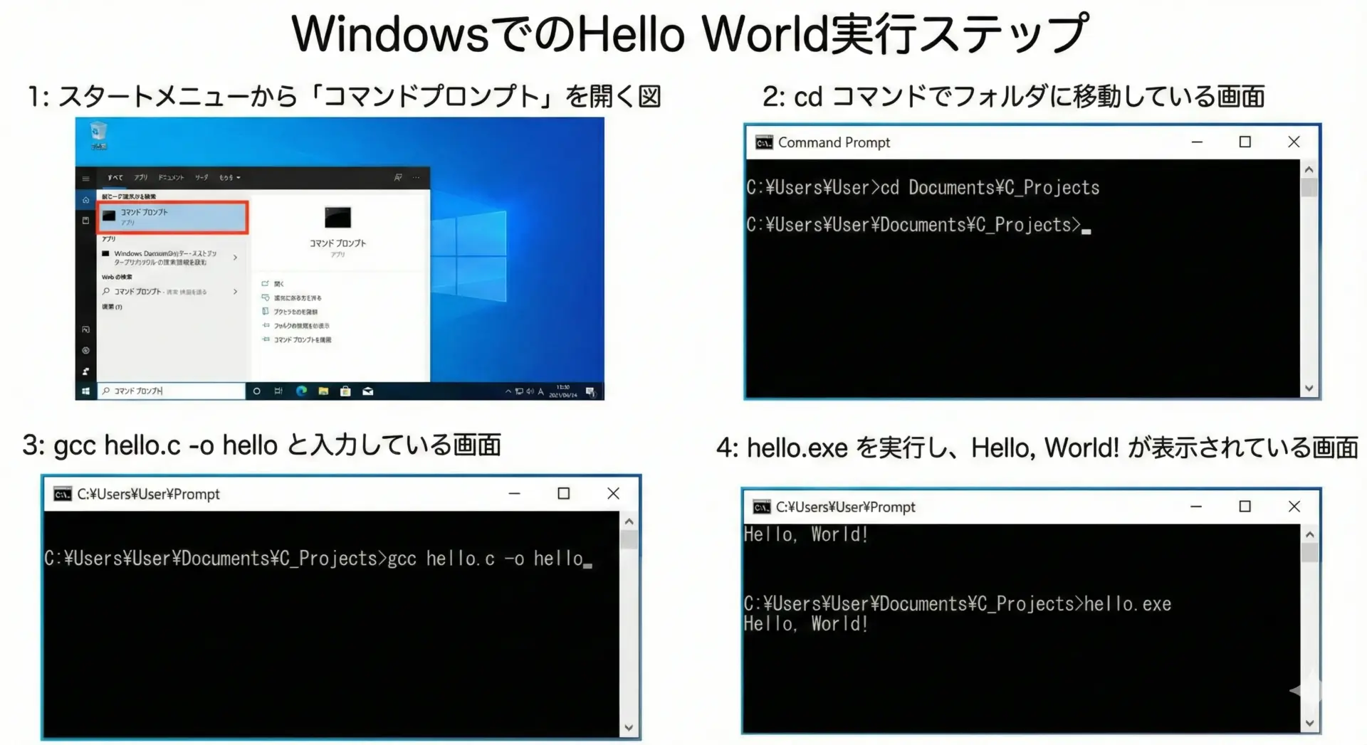 まず、コマンドライン(WindowsならコマンドプロンプトやPowerShell、Mac/Linuxならターミナル)を開き、hello.cを保存したフォルダに移動します。
