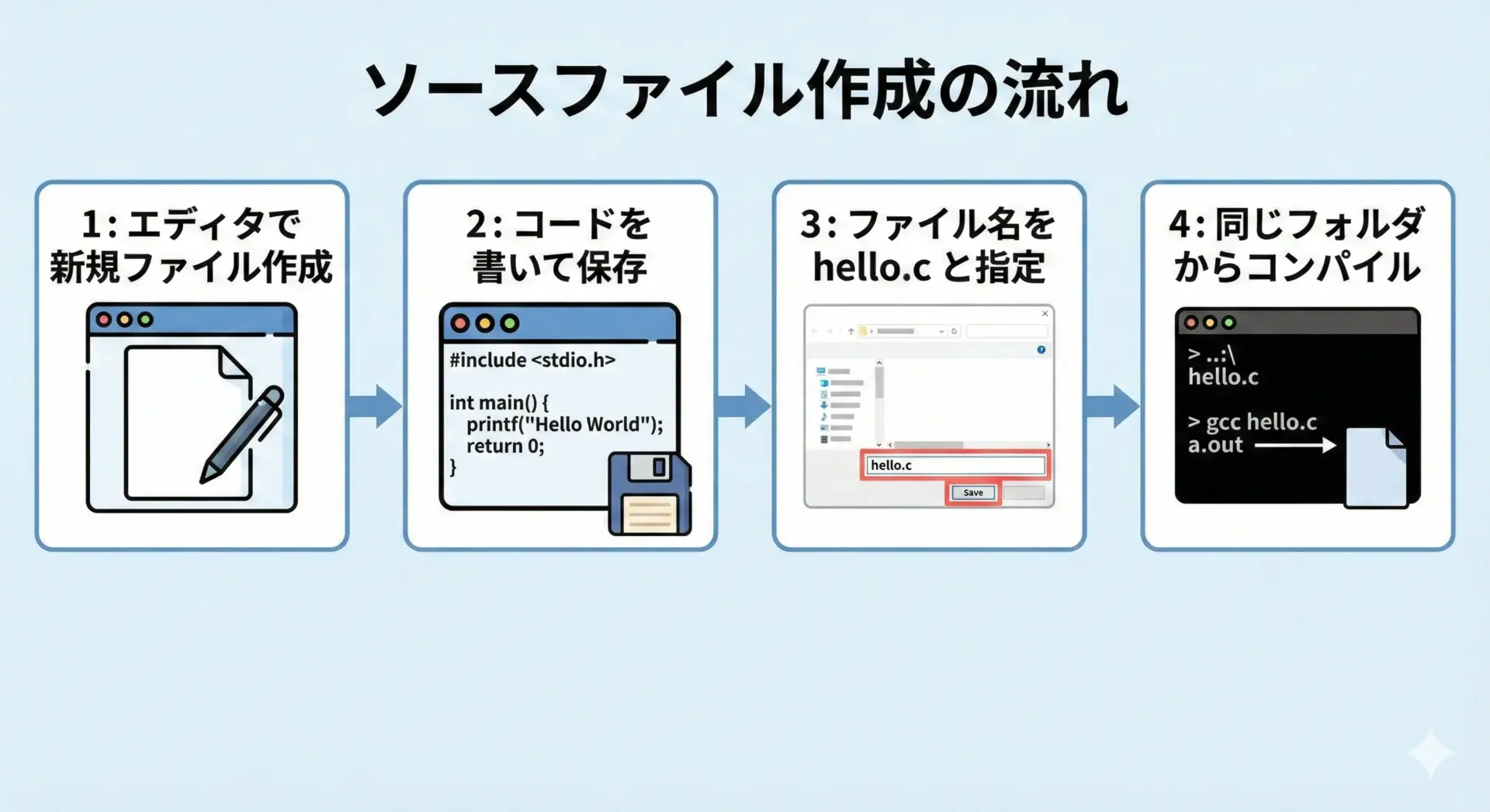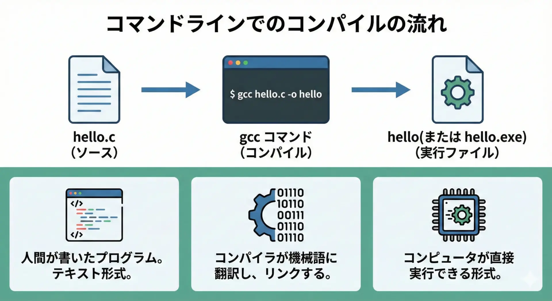 ここまでの流れ、つまり「ソースを書く → コンパイルする → 実行する」という3ステップが、C言語プログラム開発の基本パターンです。