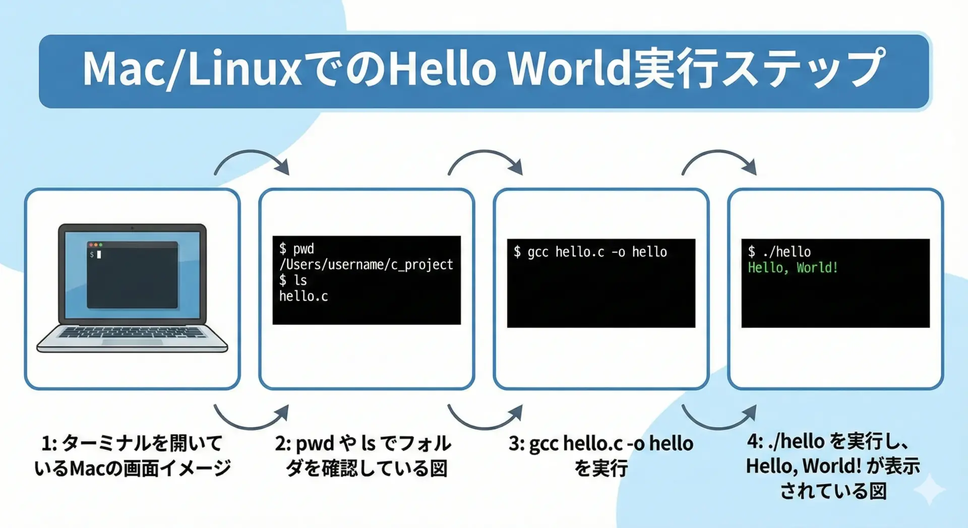 本記事では、C言語のHello Worldを「書く」「コンパイルする」「実行する」までを超丁寧に、一つずつ具体的に解説していきます。