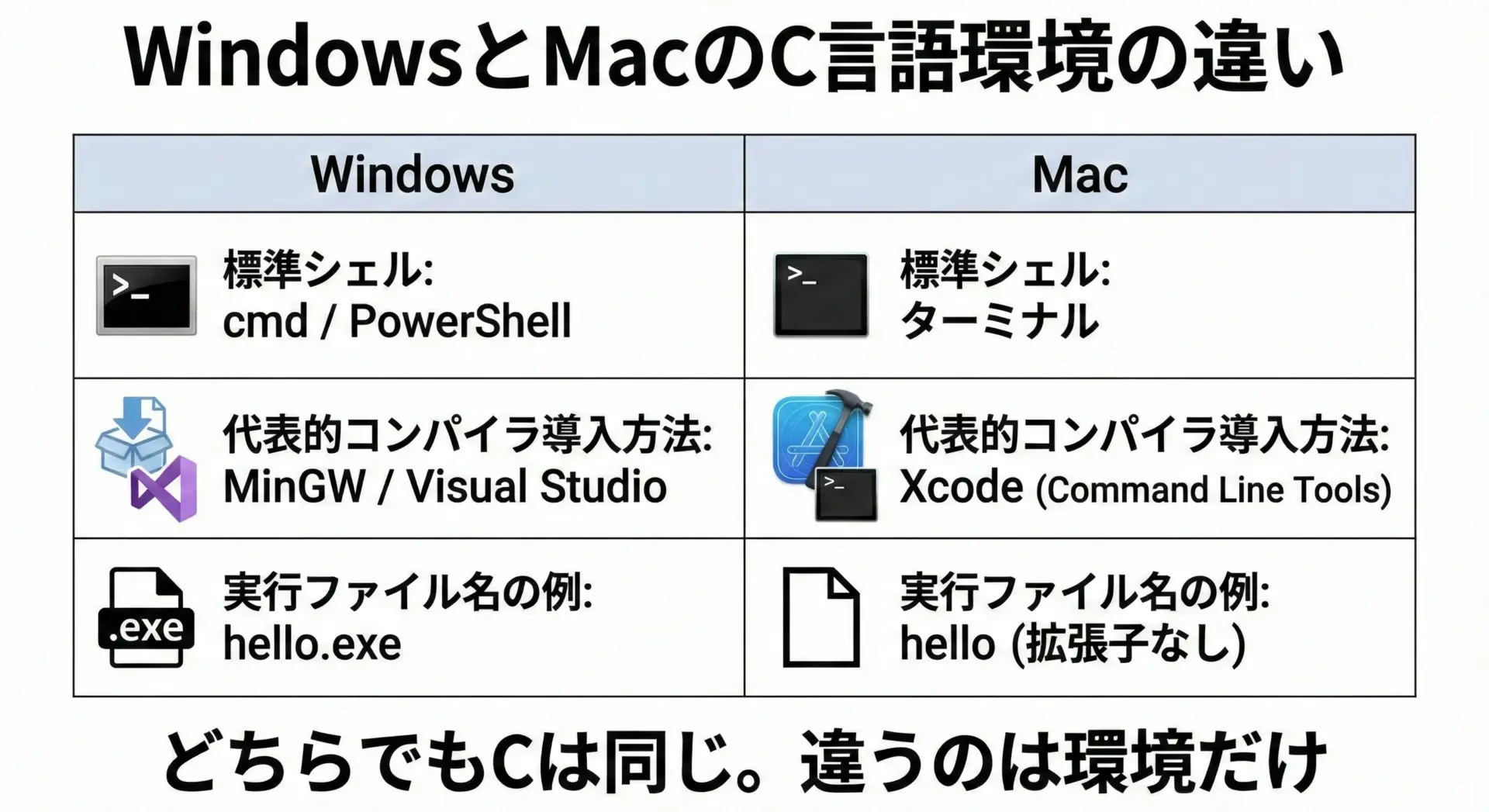 WindowsとMacでは、C言語の文法自体は同じですが、開発環境の準備方法やコマンドの細かい部分に違いがあります。