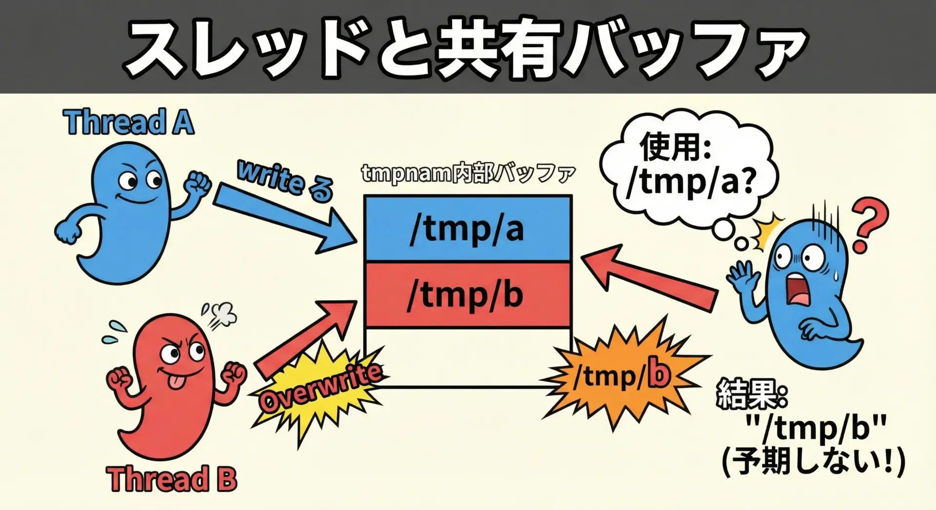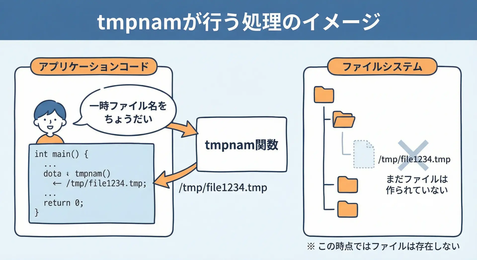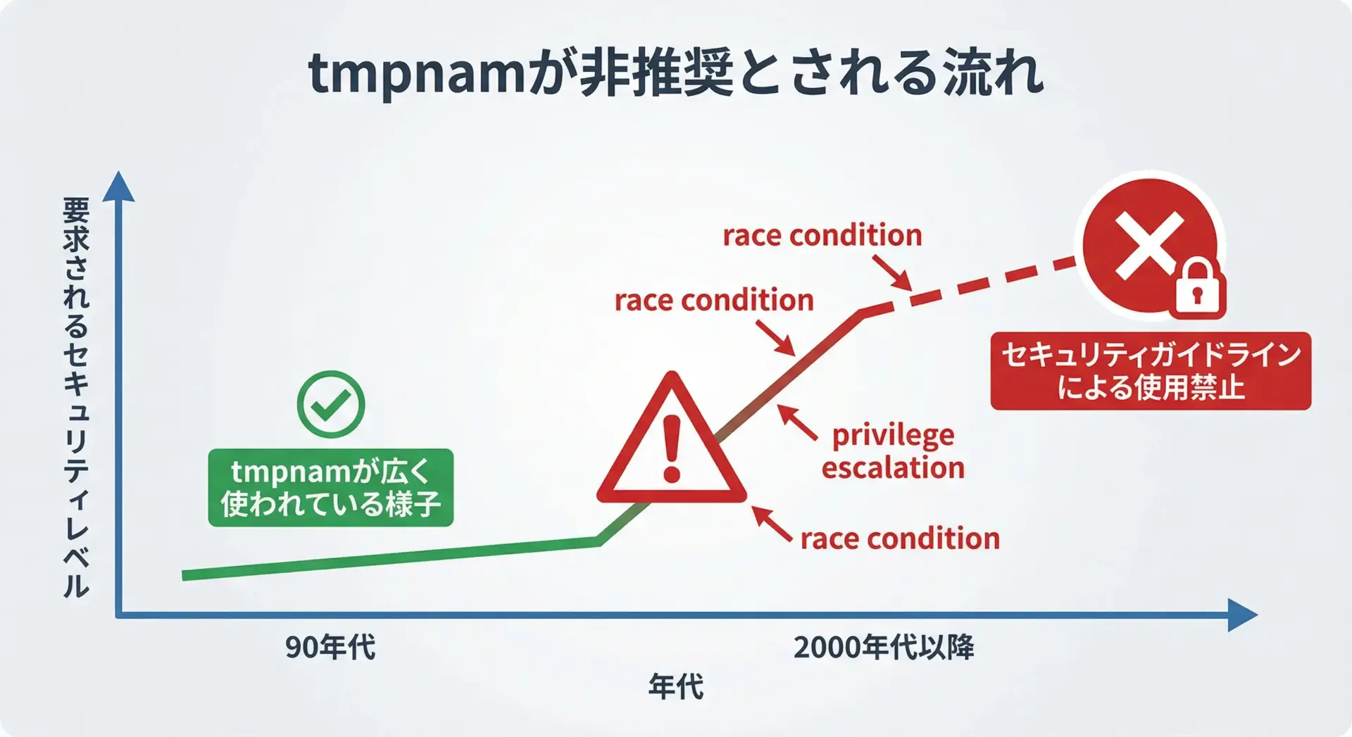 tmpnamは、かつては便利な一時ファイル名生成関数として広く利用されていましたが、レースコンディションや予測可能な名前、パーミッション問題など、現代の環境では看過できない脆弱性を抱えています。