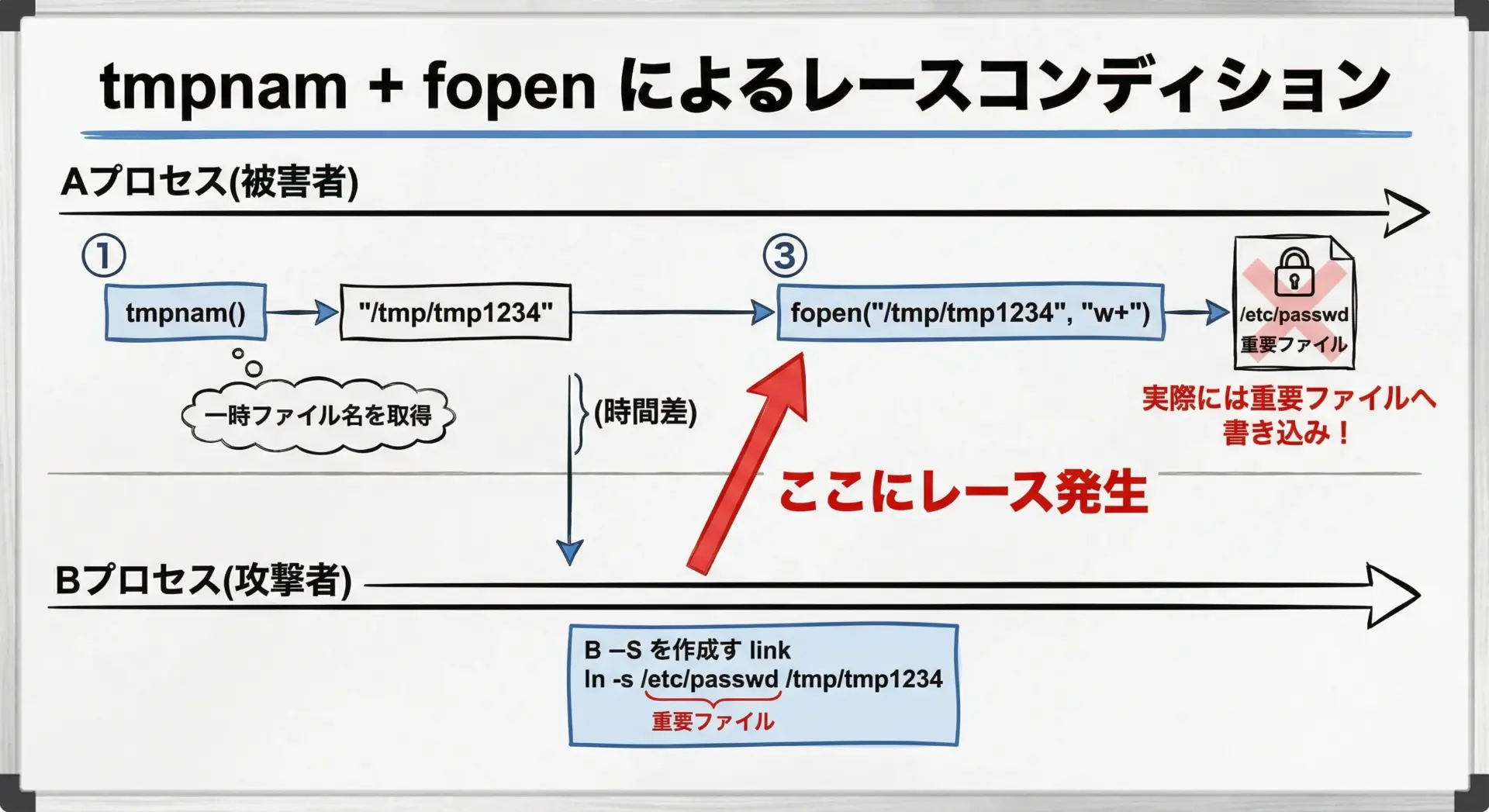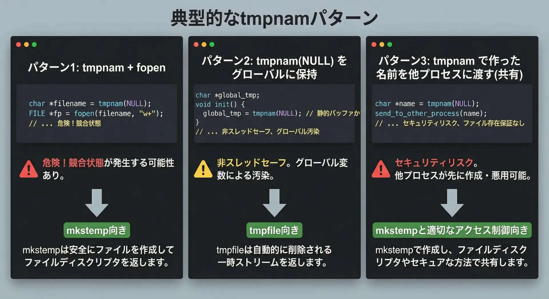 tmpnamは「ファイル名を返すだけ」で、名前の生成とファイルの作成が別々の操作になっています。この隙間の時間に他プロセスや攻撃者が同じ名前でファイルを作成する余地が生まれ、乗っ取りなどを許してしまいます。 - 予測可能なパターンによる情報漏えい・なりすまし