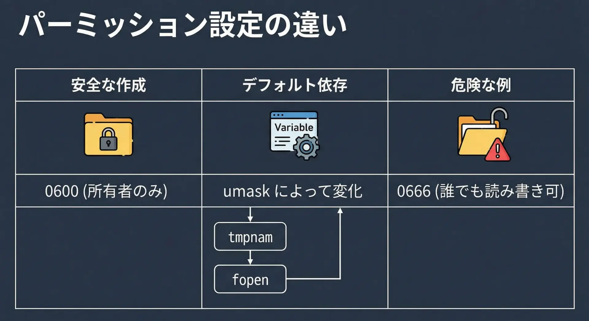一方で、安全な一時ファイル作成API(後述のmkstempなど)は、明示的に0600(所有者のみ読み書き可能)でファイルを作成するよう設計されていることが多いです。