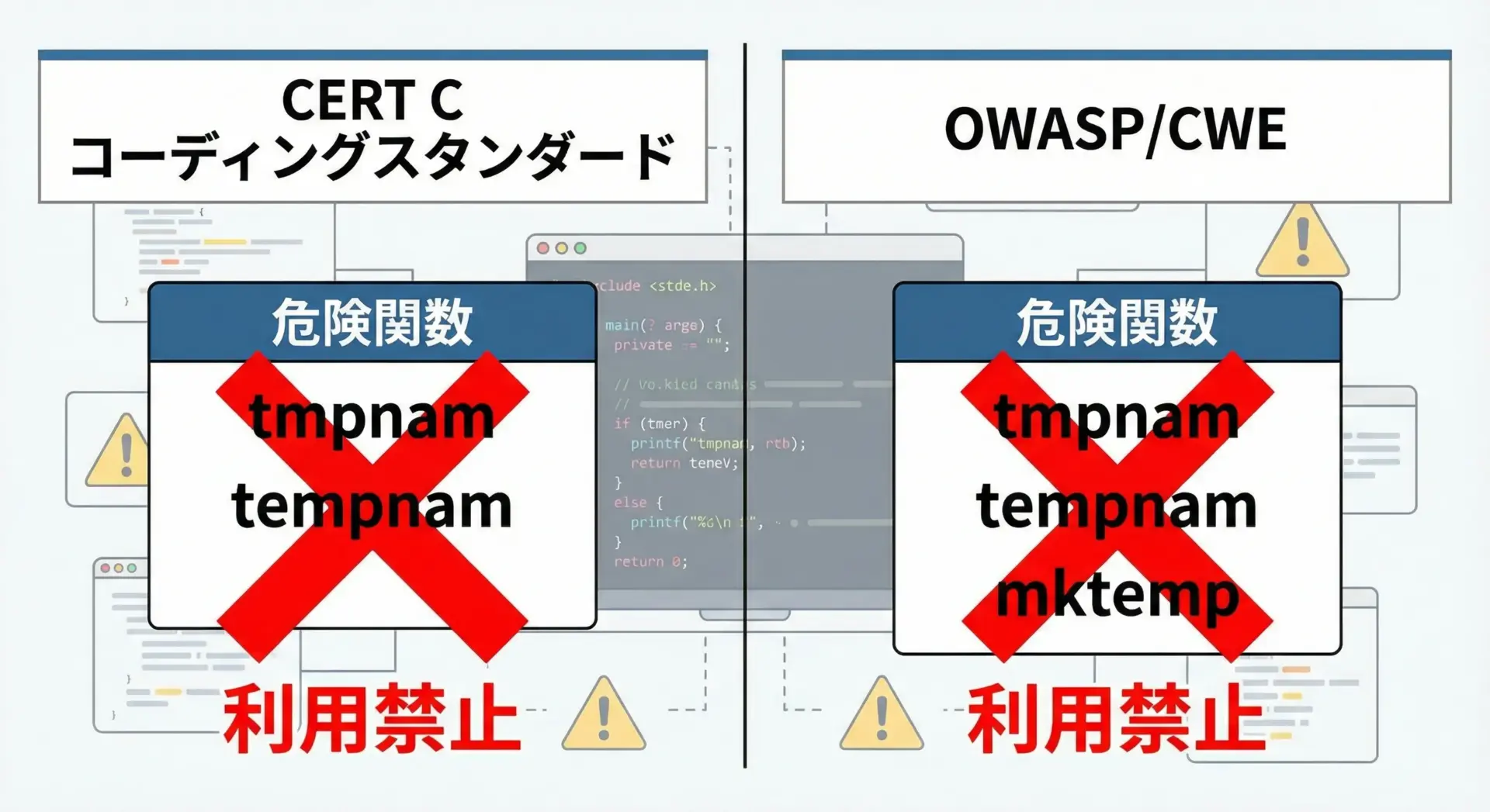 CERTやOWASPも使用を避けるよう明確に勧告しており、新規コードでの利用はもちろん、既存コードについてもmkstempやtmpfileなどの安全なAPIへの置き換えが必須です。