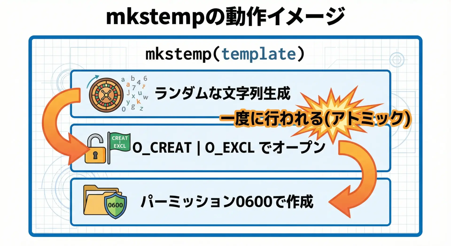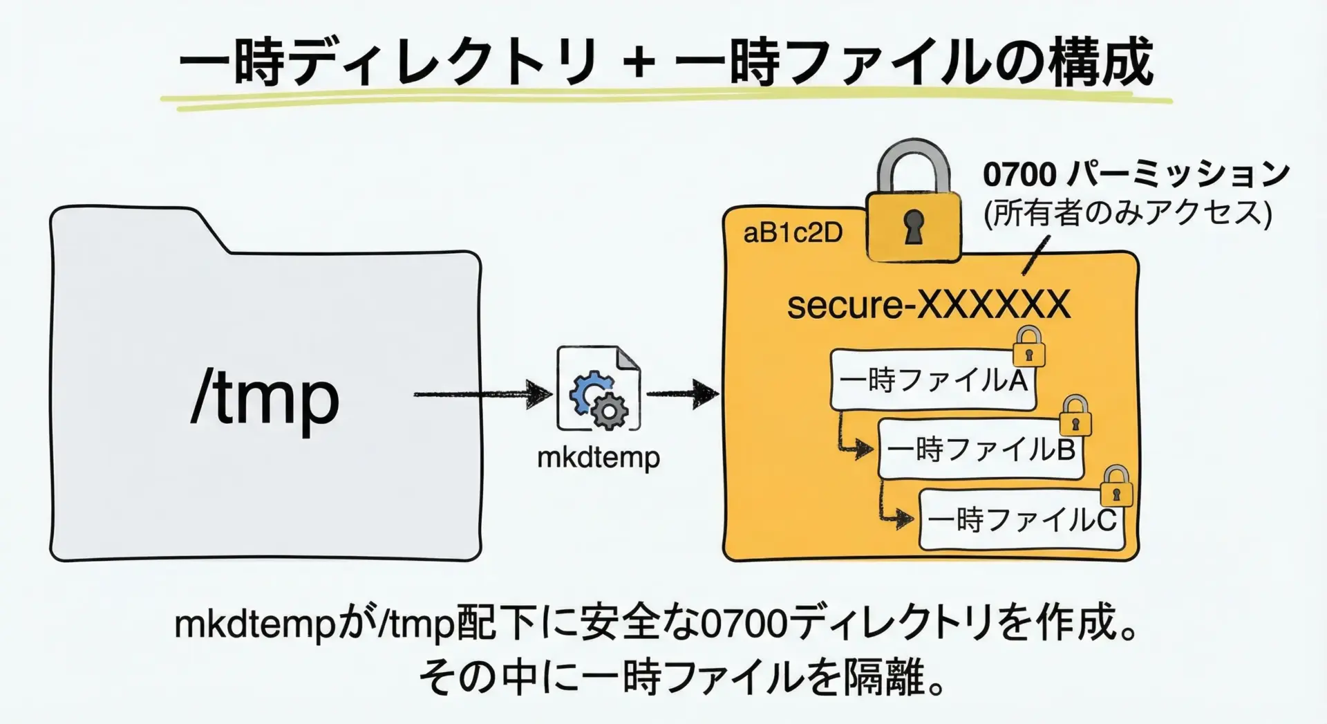 このように、一時ディレクトリ + mkstempの組み合わせは、セキュアで管理しやすい一時領域を提供します。