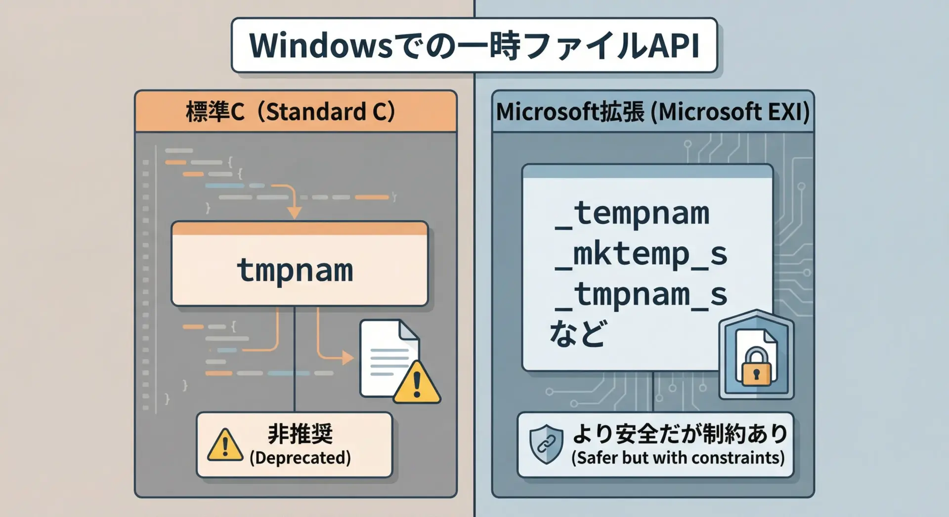 Windows環境では、標準Cのtmpnamのほかに、Microsoft独自拡張として_tmpnam_sや_mktemp_sなどの「セキュアバージョン」が提供されています。