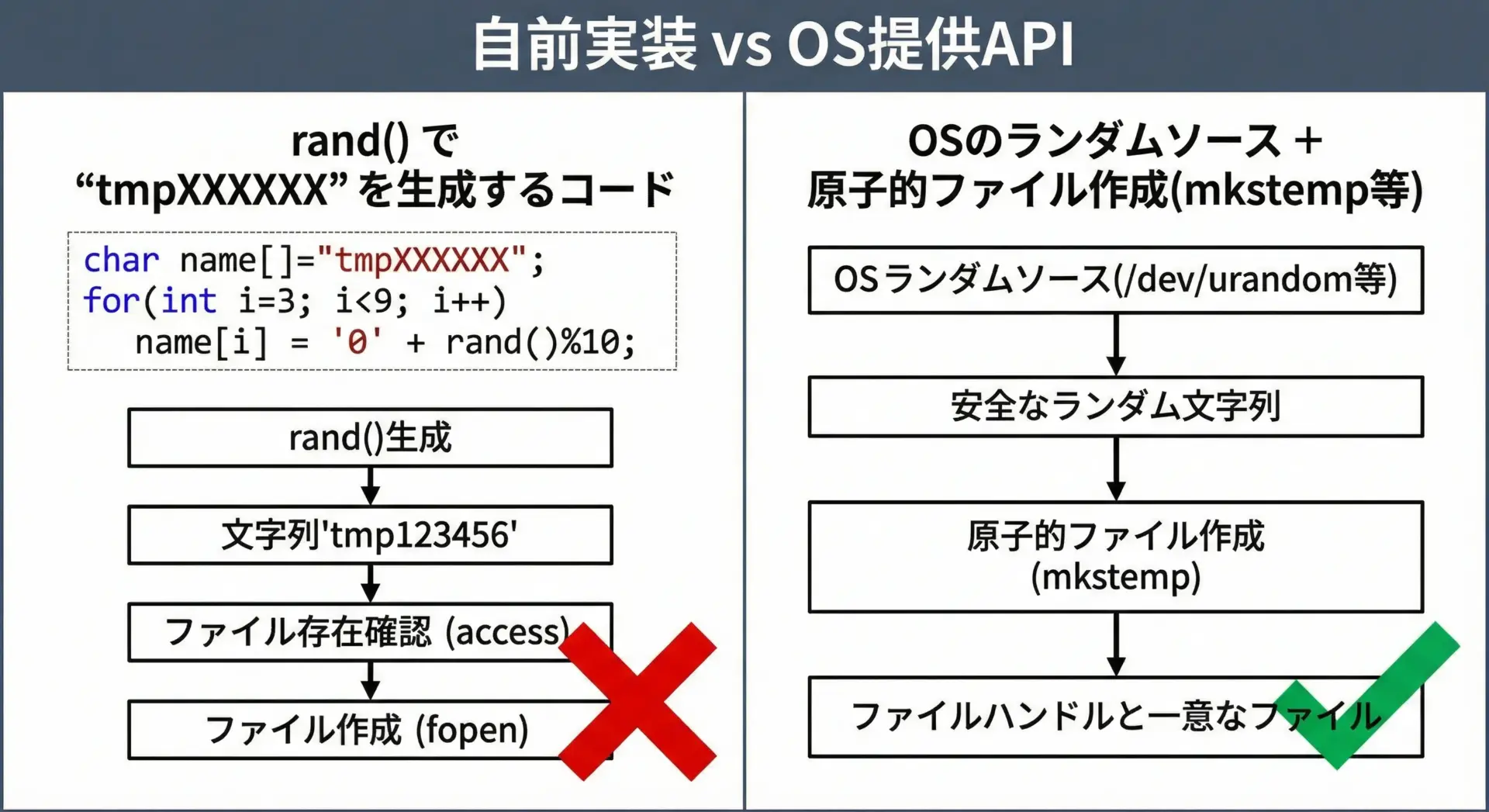 一時ファイルの安全な作成は、OSや標準ライブラリが提供するAPIに任せるのが原則です。