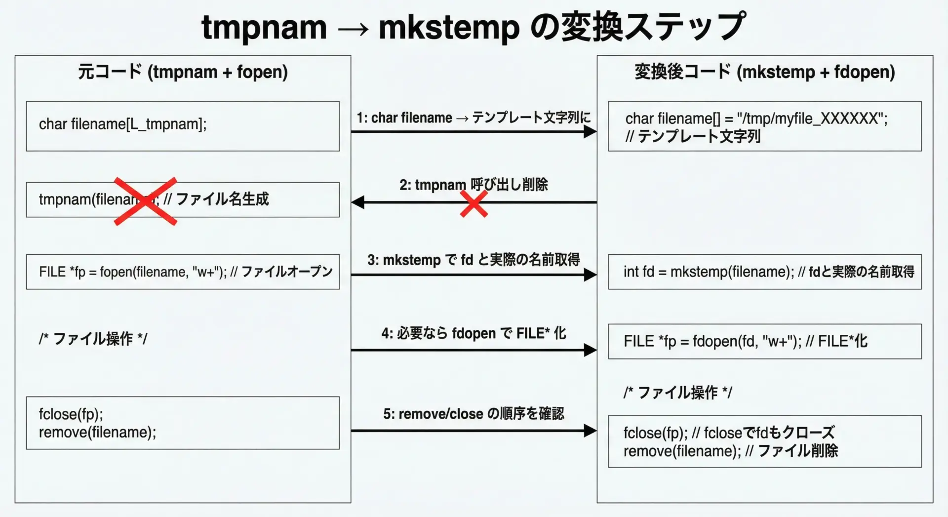 典型的なtmpnam + fopenパターンを、mkstempに置き換える手順を具体的なコードで示します。