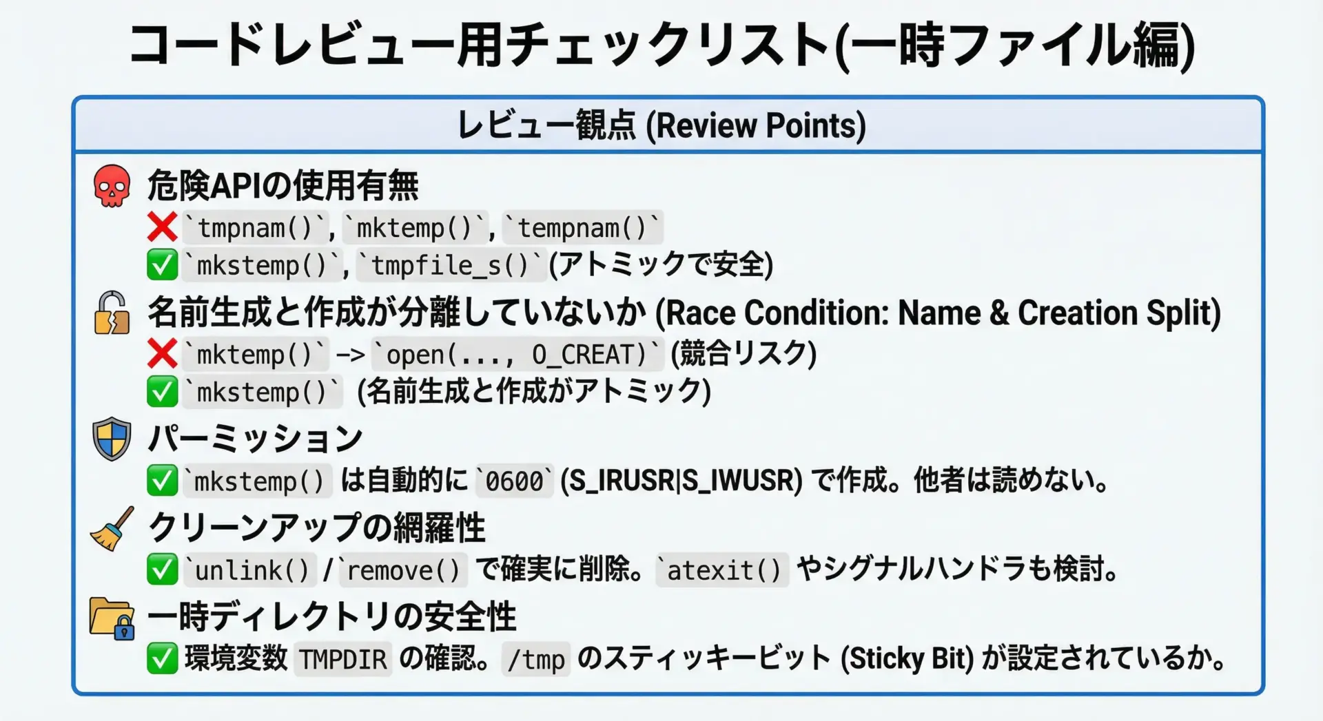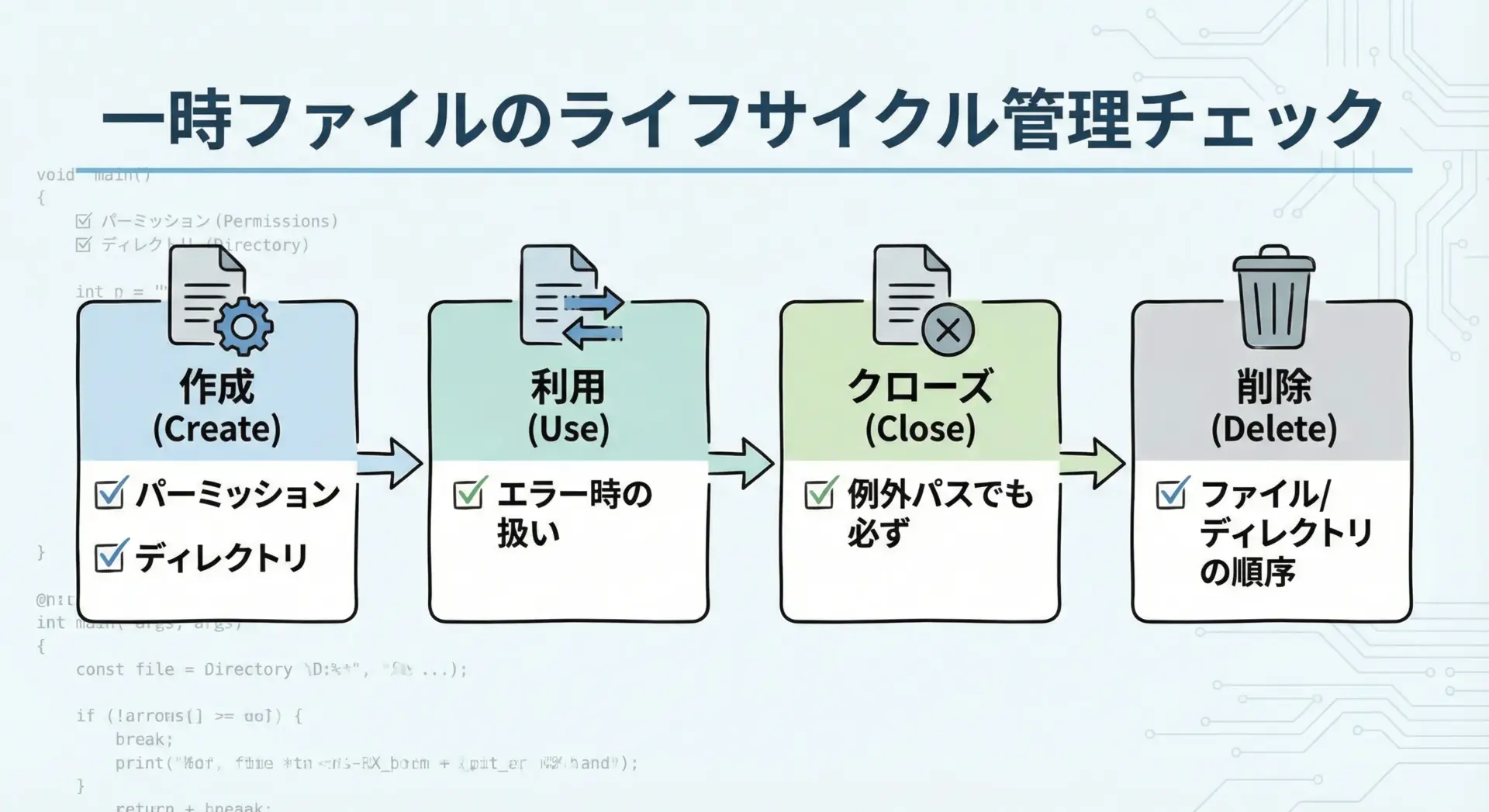 コードレビュー時には、次のような観点で一時ファイル処理をチェックするとよいです。