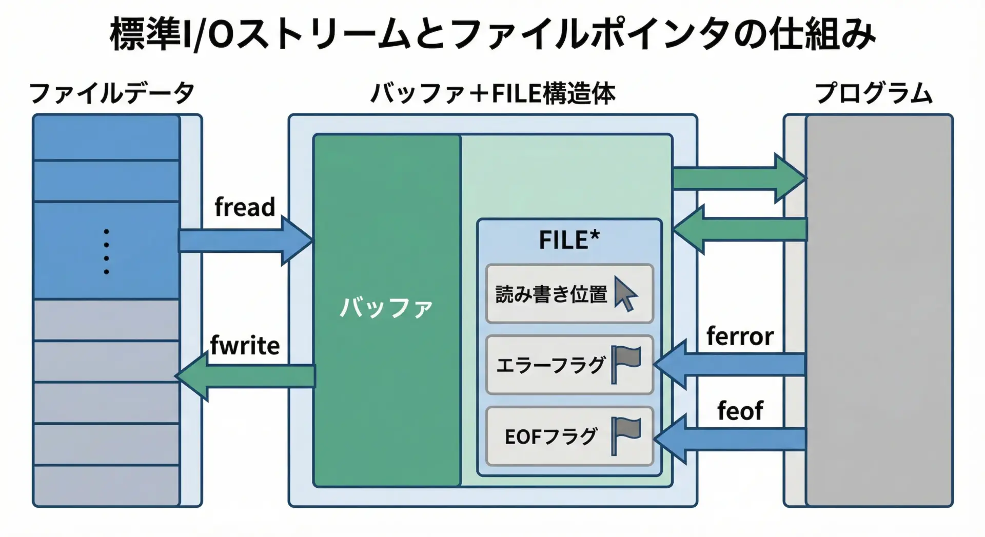 Cのストリームはfeofとferrorというスティッキーな状態を持ち、戻り値だけでは原因を判断できない場面が多くあります。