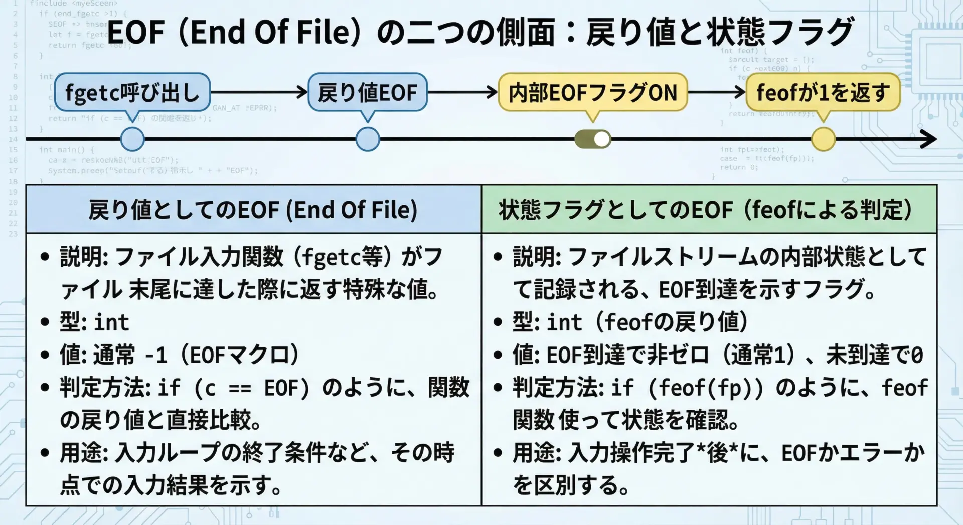 終端(EOF)と入出力エラーの区別は、堅牢なI/O処理の第一歩です。