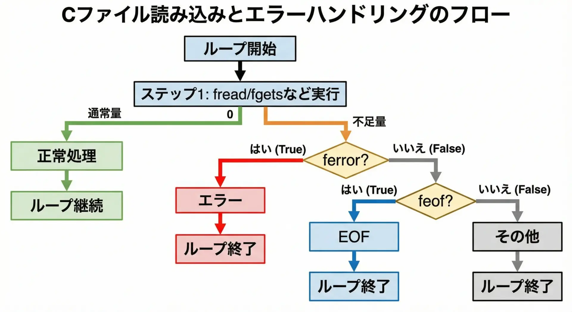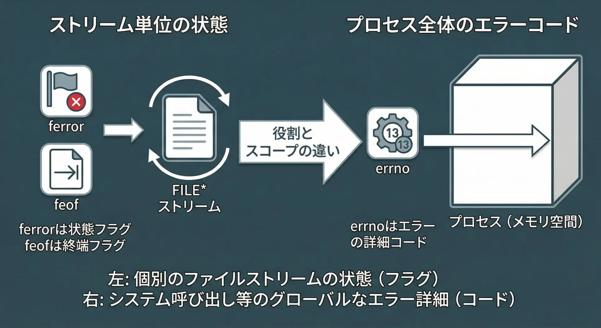 関数はしばしば特別な戻り値(例: EOFやNULL、負値、読み取り個数0)で失敗を示しますが、その原因が終端なのかエラーなのかは戻り値だけでは区別できないことがあります。