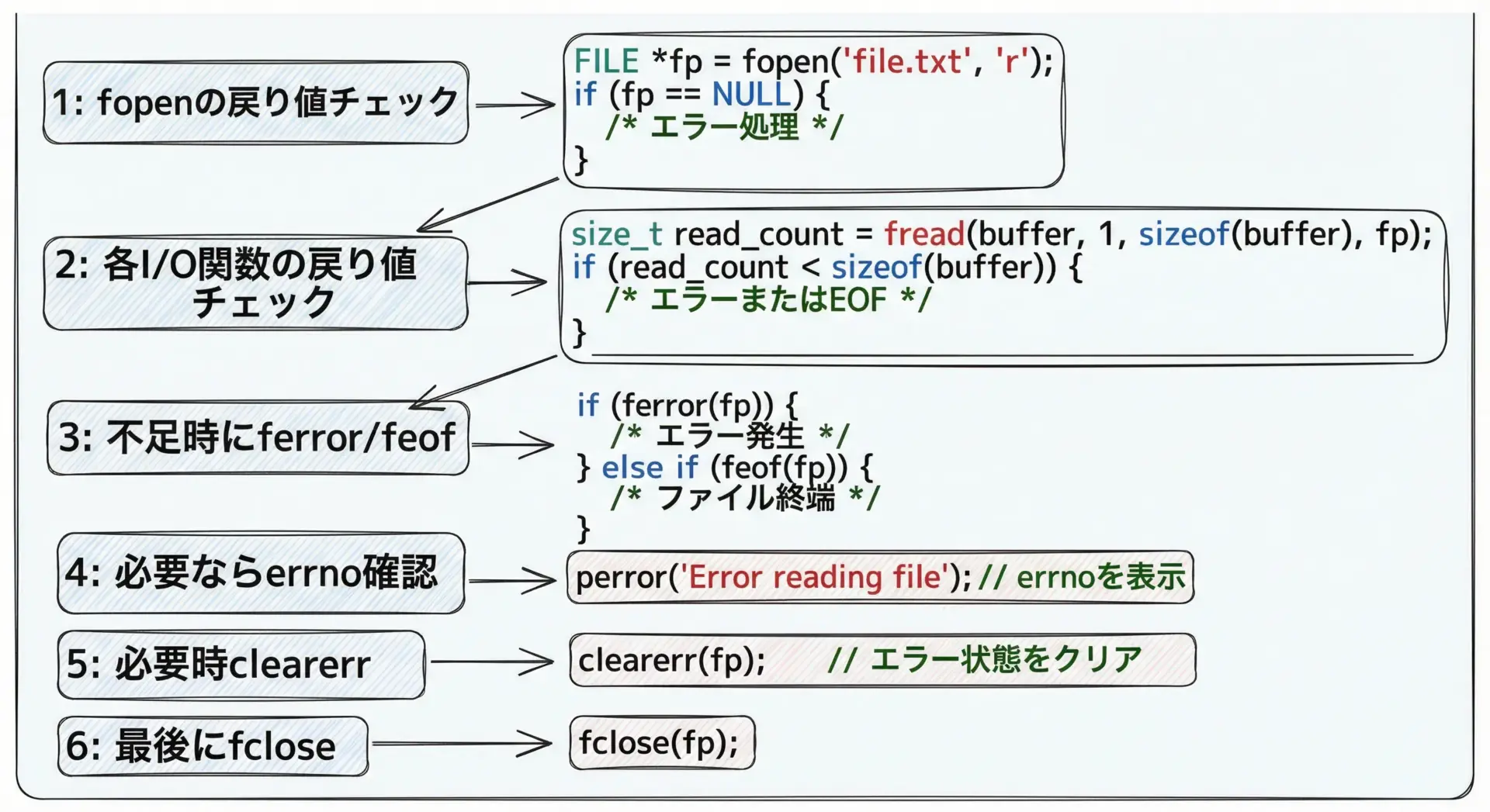 書き込みエラーは気づきにくいため、重要な出力の直後はfflushとferrorを確認するのが堅実です。