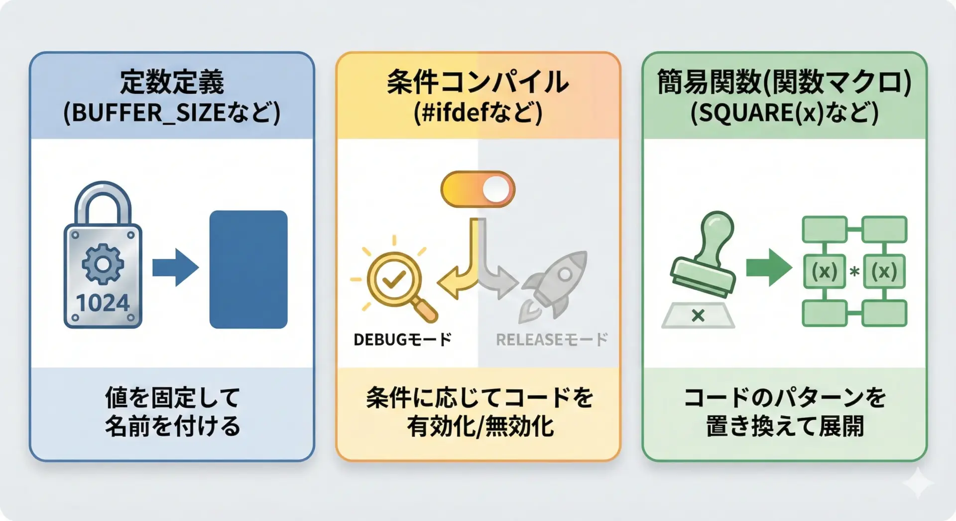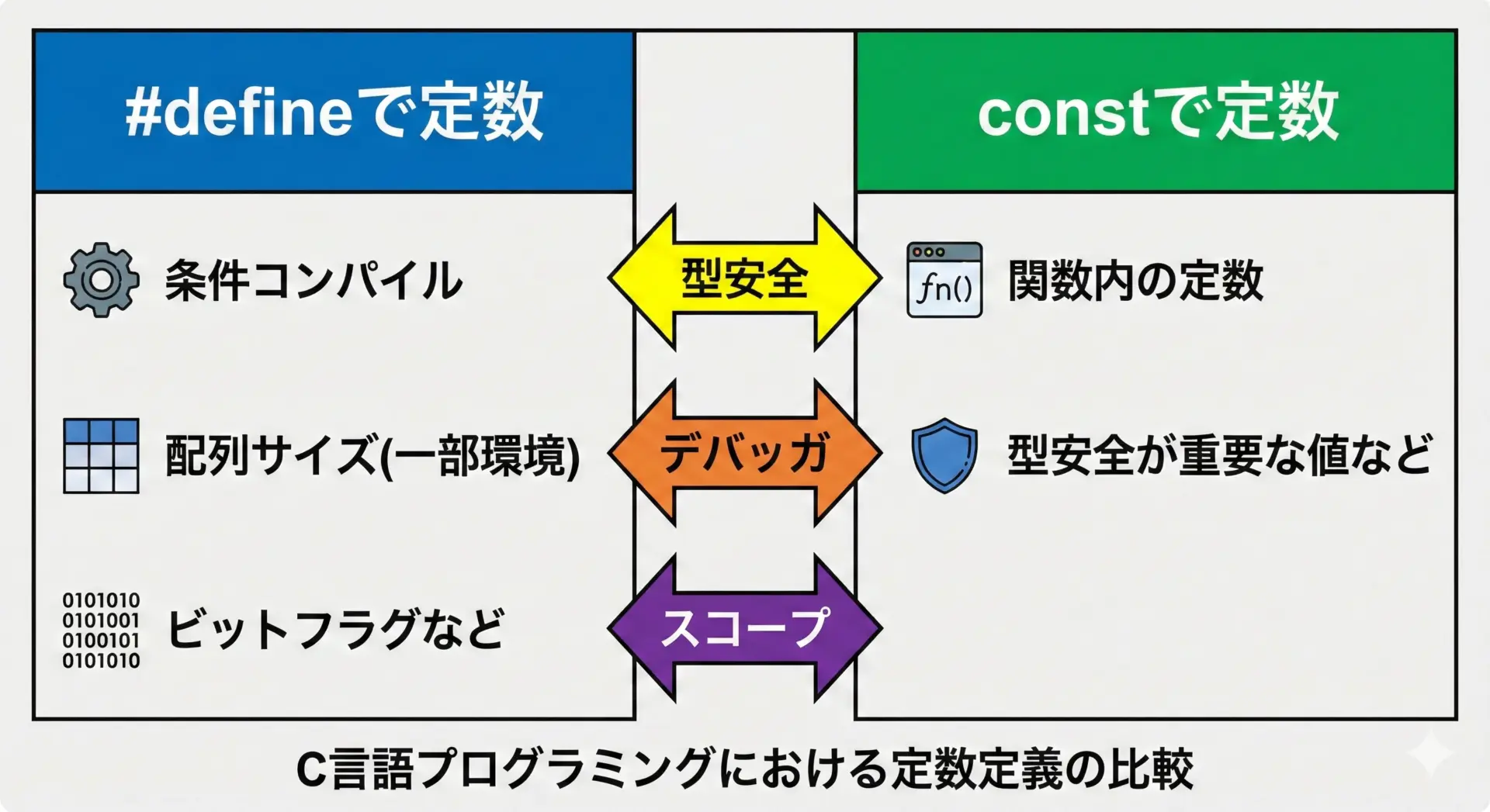 一方で、条件コンパイルやヘッダで共有する定数など、プリプロセッサならではの用途では非常に強力な道具となります。
