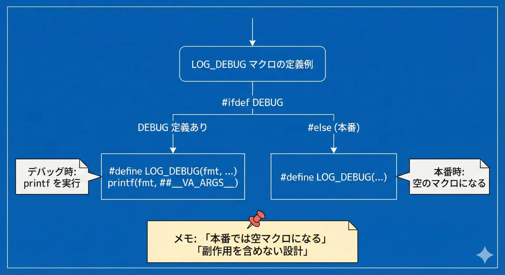 例えばLOG_DEBUG("x = %d", x++)のように書いてしまうと、本番ビルドでマクロが空になったときにx++が評価されなくなり、動作が変わってしまう可能性があります。