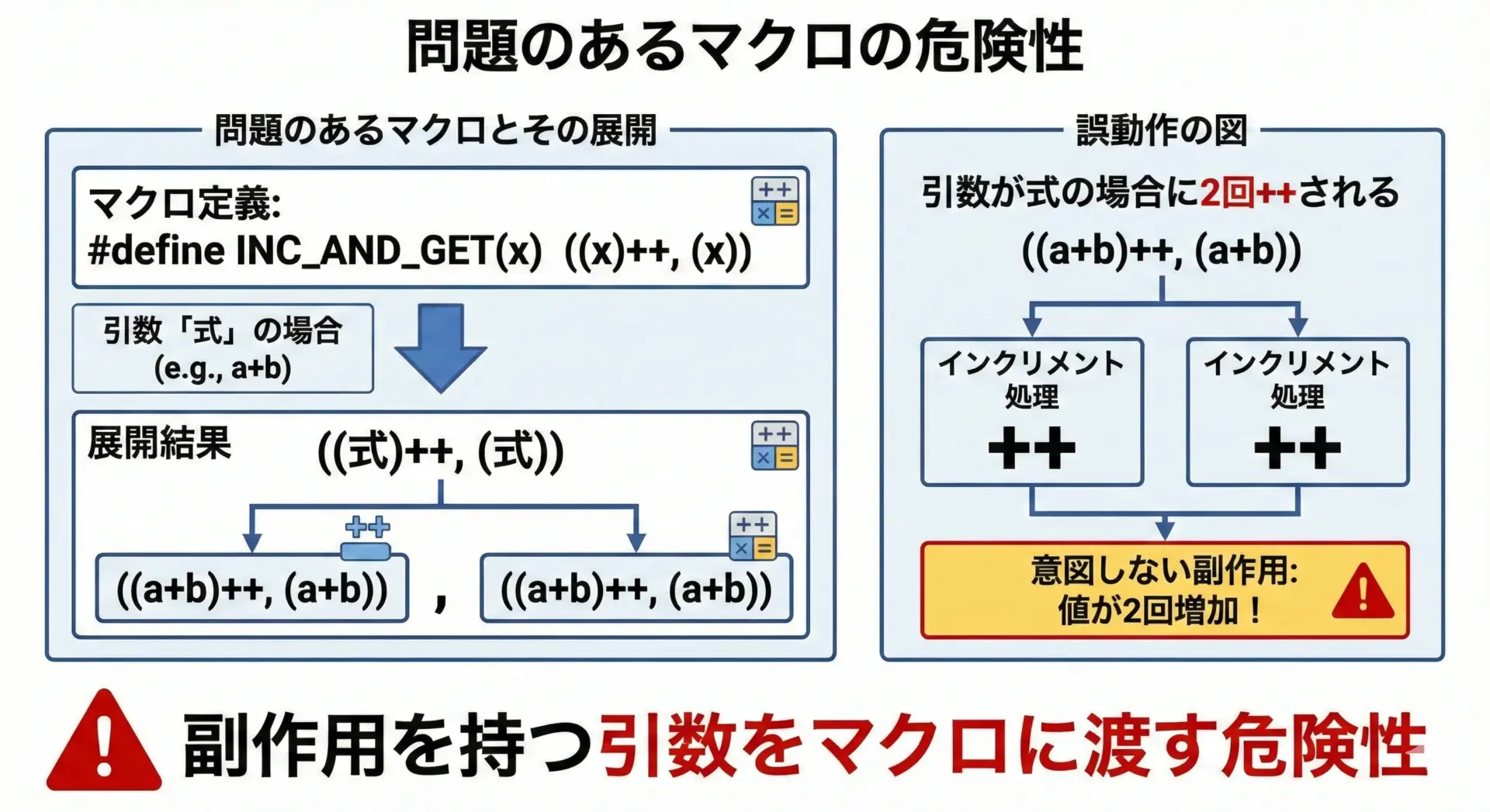 特に、インクリメント演算子や関数呼び出しを引数に渡したとき、予期せぬ副作用を引き起こすことがあります。