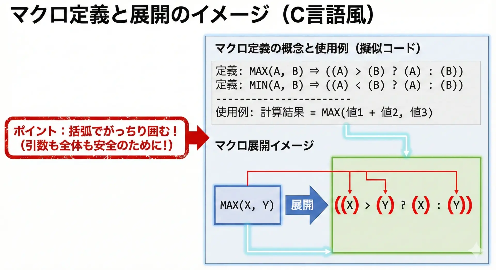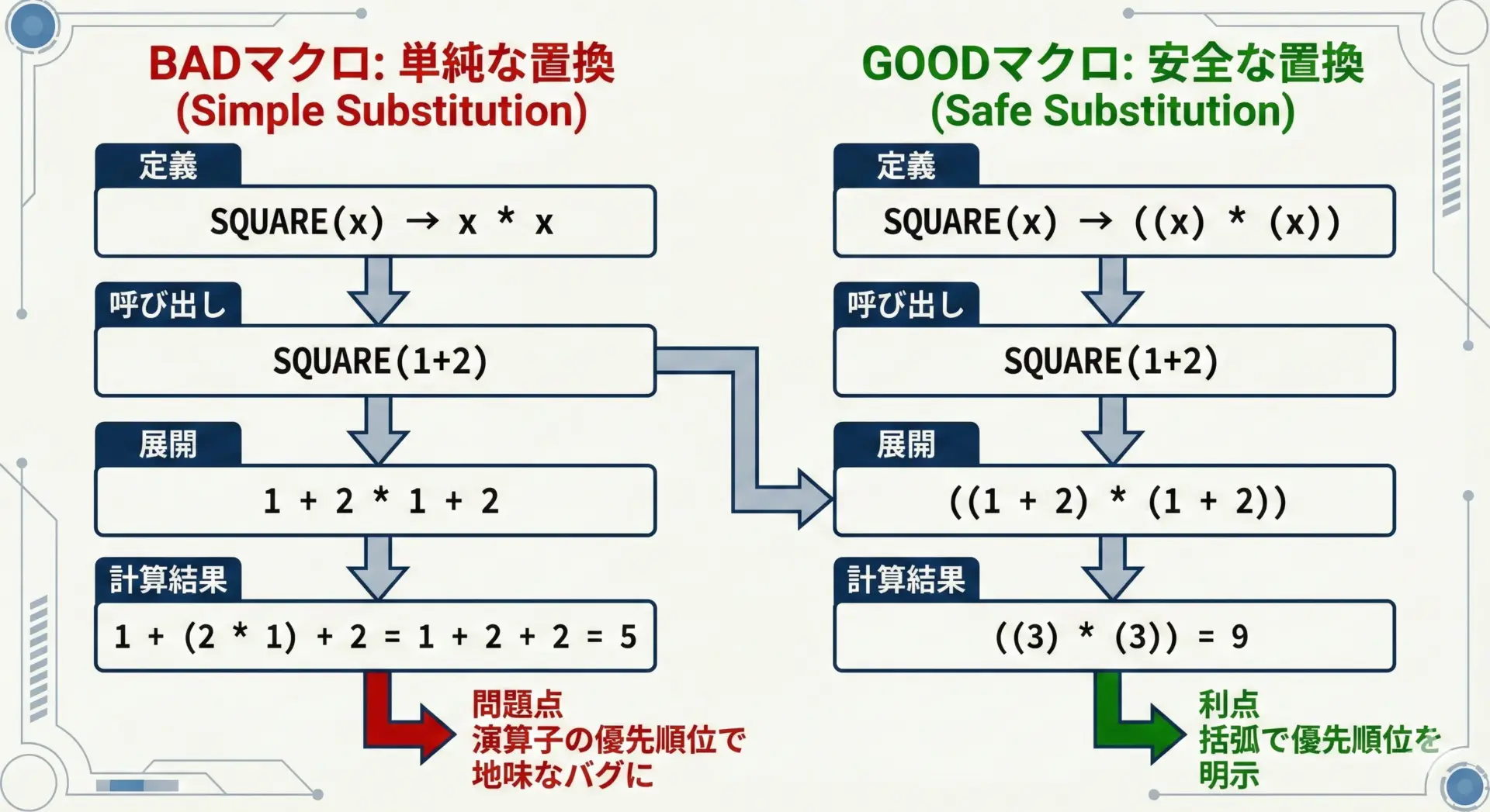 このようなバグは、見た目では発見しづらく、長期間潜伏することも多いため、マクロ定義では「引数と全体を必ず括弧で囲む」というルールを徹底することが非常に重要です。