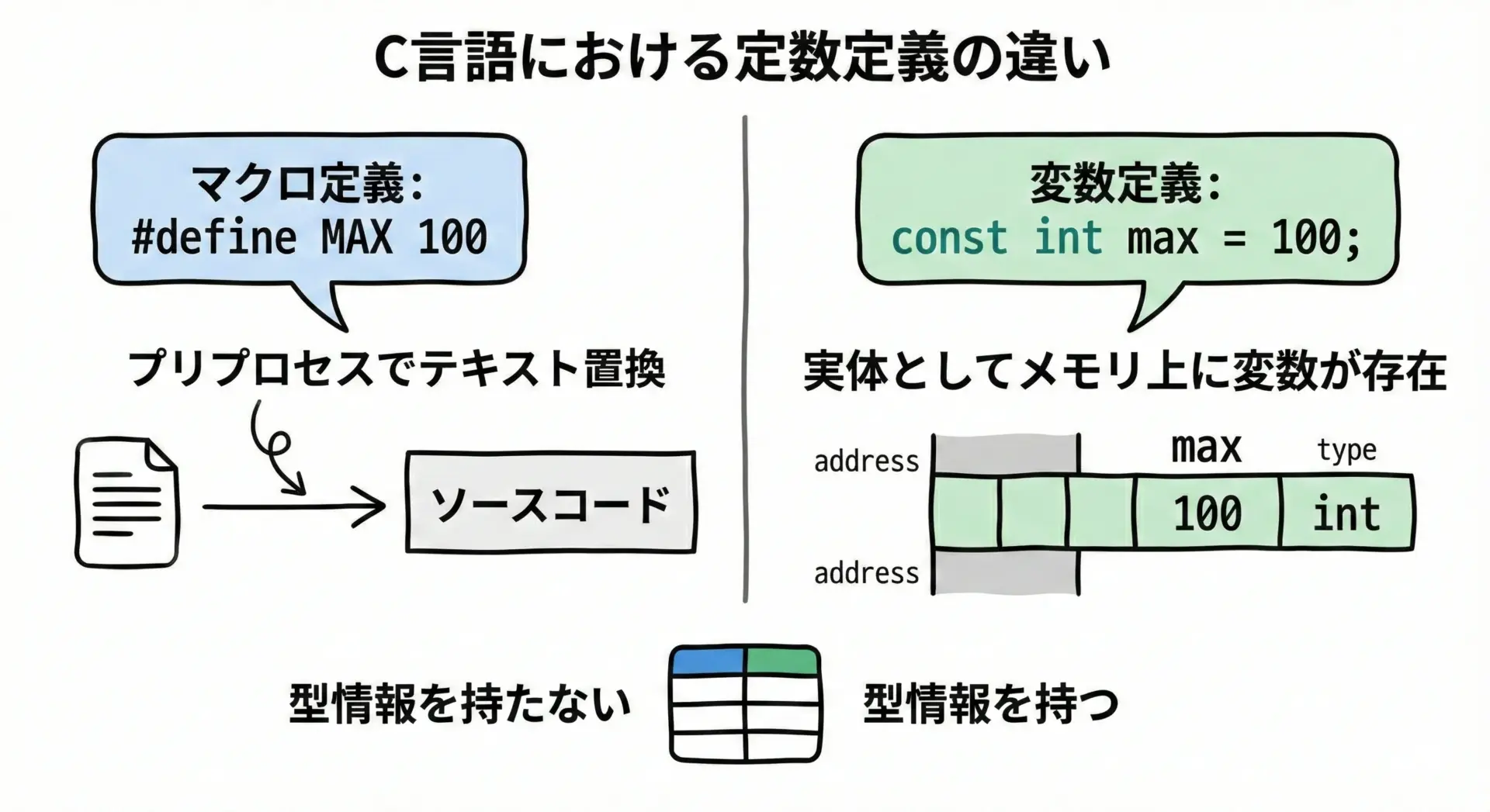 つまり、#defineは「文字列の置換ルール」であり、constは「変更できない変数」と考えると理解しやすくなります。