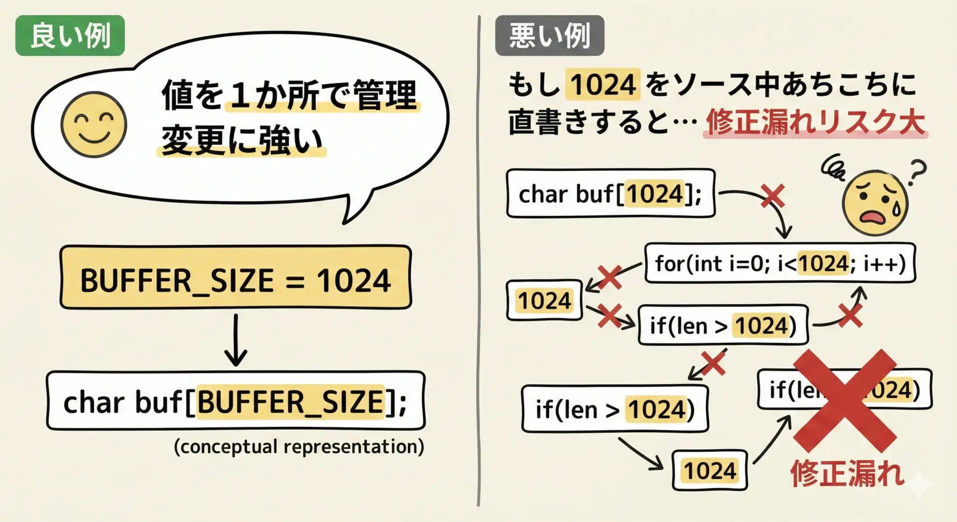 もし1024という数字をソースコード中に直接書いてしまうと、後で2048に変更したいときに修正漏れを起こしやすくなります