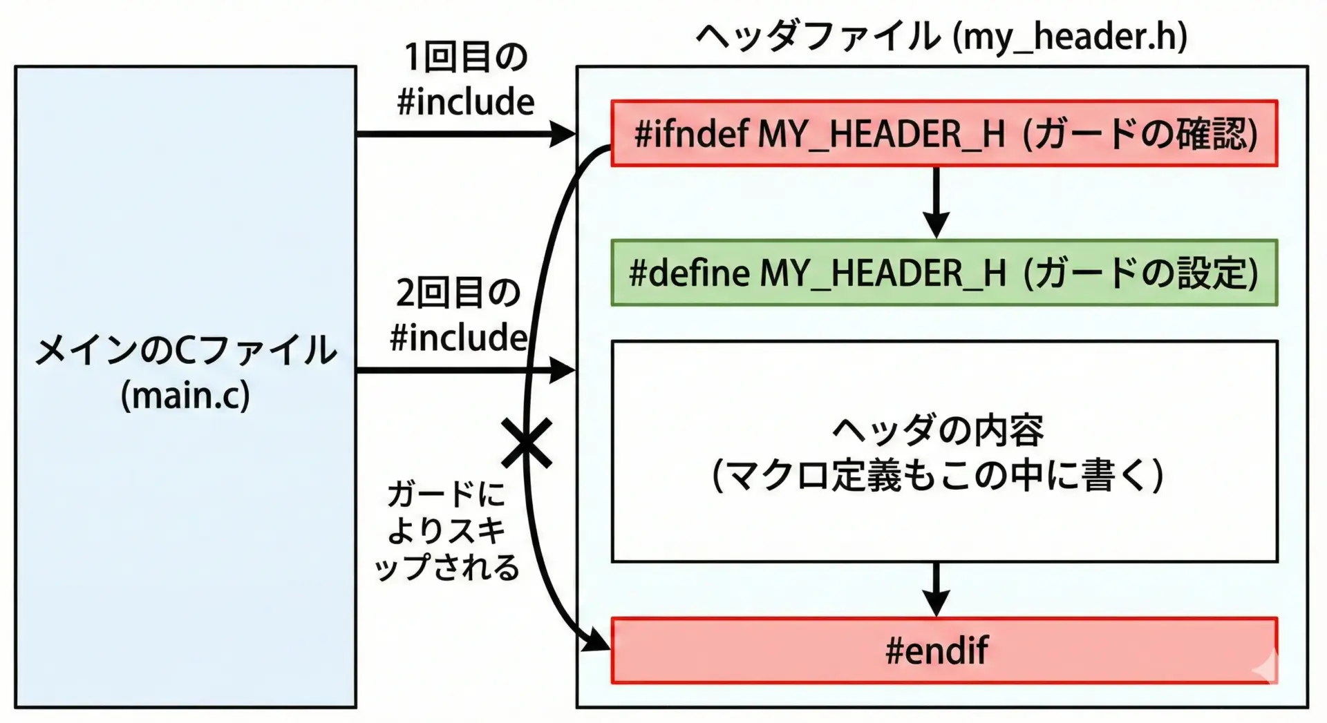 マクロ定義もこのガードの内側に書くことで、多重定義のリスクを大幅に減らせます