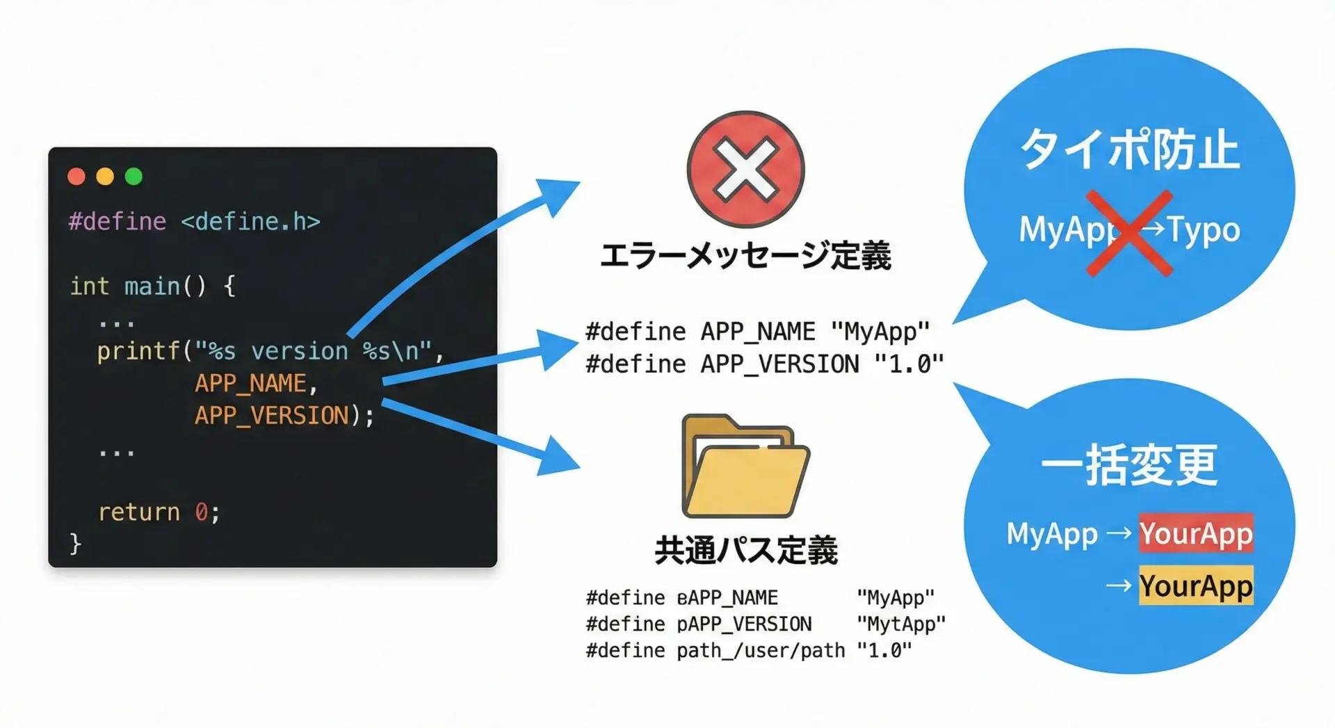 名称やパスが変わったときも、#defineの定義を1か所変更するだけで済みます。