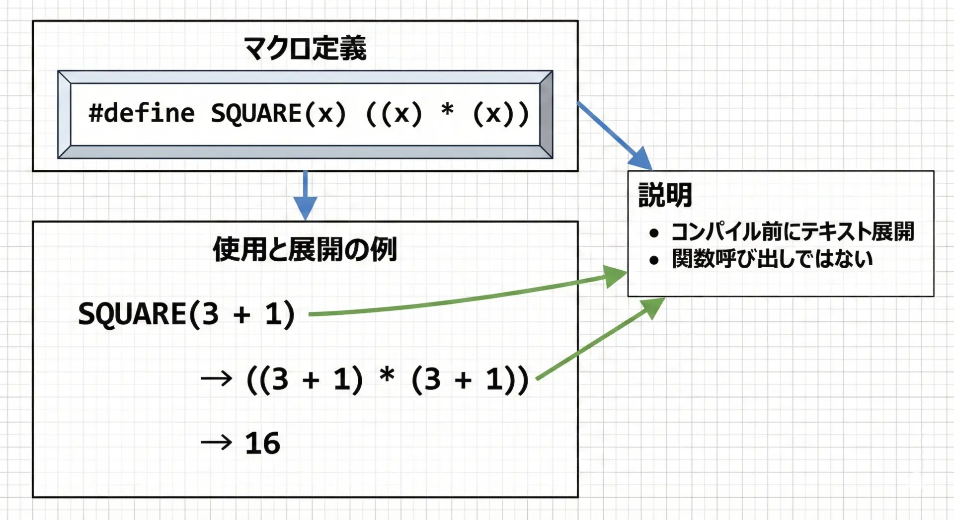 マクロはあくまでテキスト置換であり、型安全性や副作用の制御には注意が必要です。